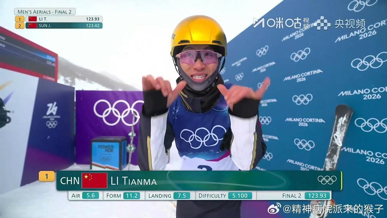 王心迪🇨🇳夺冠[赞][笑哭]! 夫妻双双夺冠!中国队第四金到手! 瑞士选手维尔纳尔🇨🇭摔跤了! 王心迪132.60分!瑞士另一名选手诺尔🇨🇭获得银牌! 王心迪是前几天在女子项目上夺得奥运冠军徐梦桃🇨🇳的老公! 四名中国选手和两个瑞士🇨🇭选手晋级了2026米兰冬奥会男子空中技巧总决赛,一跳定胜负, 李天马🇨🇳123.93分获得铜牌🥉! 孙家俊🇨🇳决赛轮123.42分,获得第四名,齐广璞🇨🇳落地背部触雪,最后获得81分,获得第六名! 洁白的雪地上将要升起同时两面红旗[奋斗]!中国队一金一铜[赞][笑哭]!