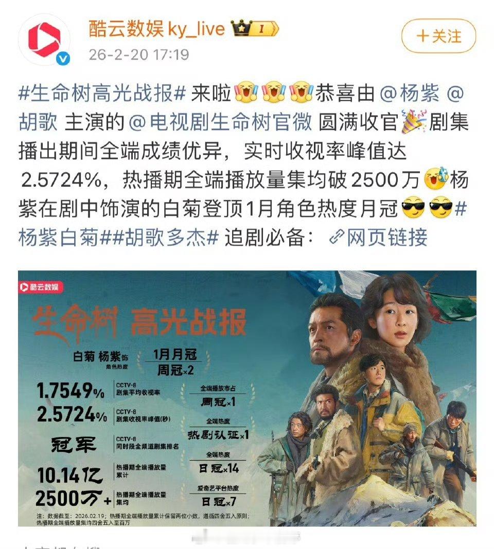 酷云发了杨紫生命树高光战报!杨紫生命树伟大!