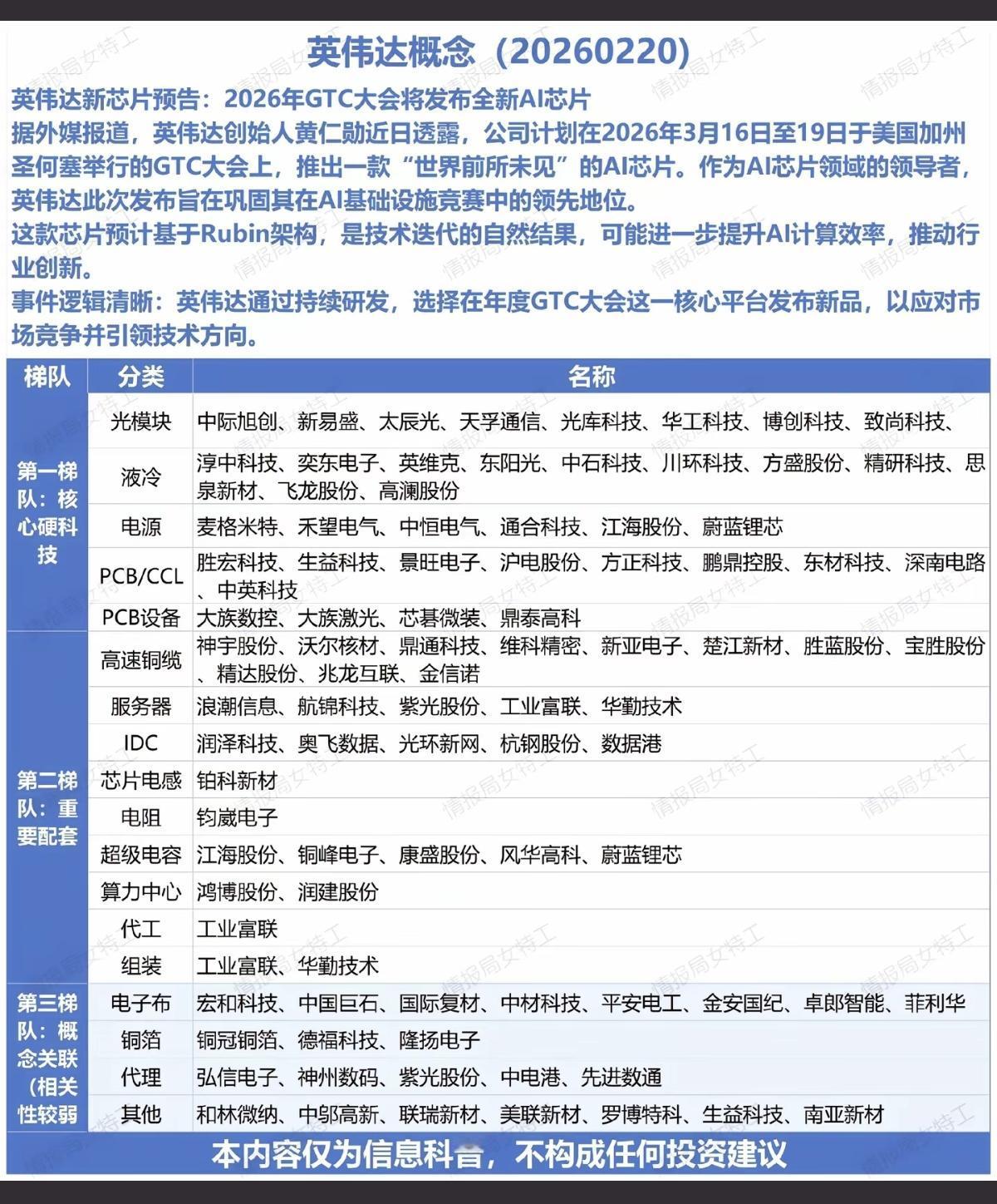 英伟达——全新AI芯片 概念! 英伟达新芯片预告:2026年GTC大会将发布全新AI芯片! 据外媒报道,英伟达创始人黄仁勋近日透露,公司计划在3月16日至19日于美国加州举行的GTC大会上推出一款“世界前所未见”的AI芯片! 1.核心硬科技(液冷,光模块,PCB) 2.重要配套(超级电容、算力、高速铜缆) 3.关联个股(电子布、铜箔)