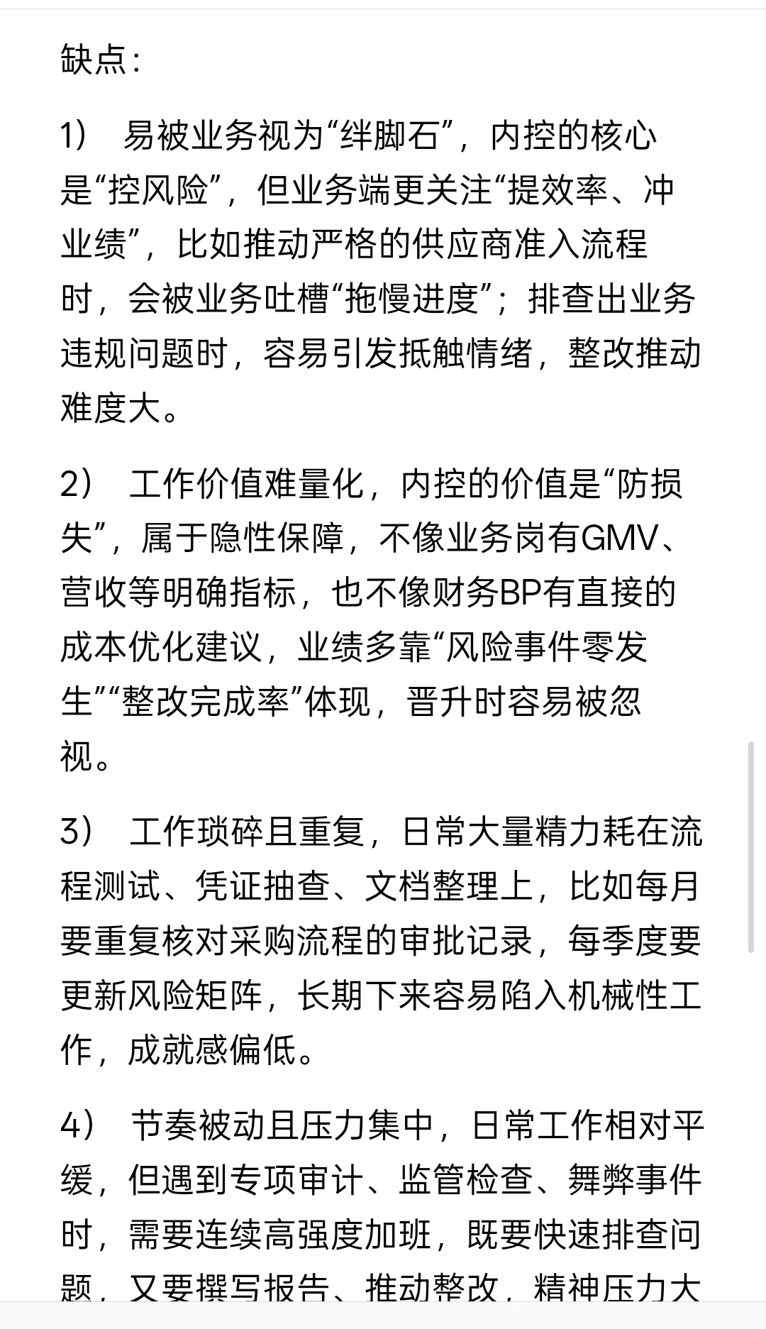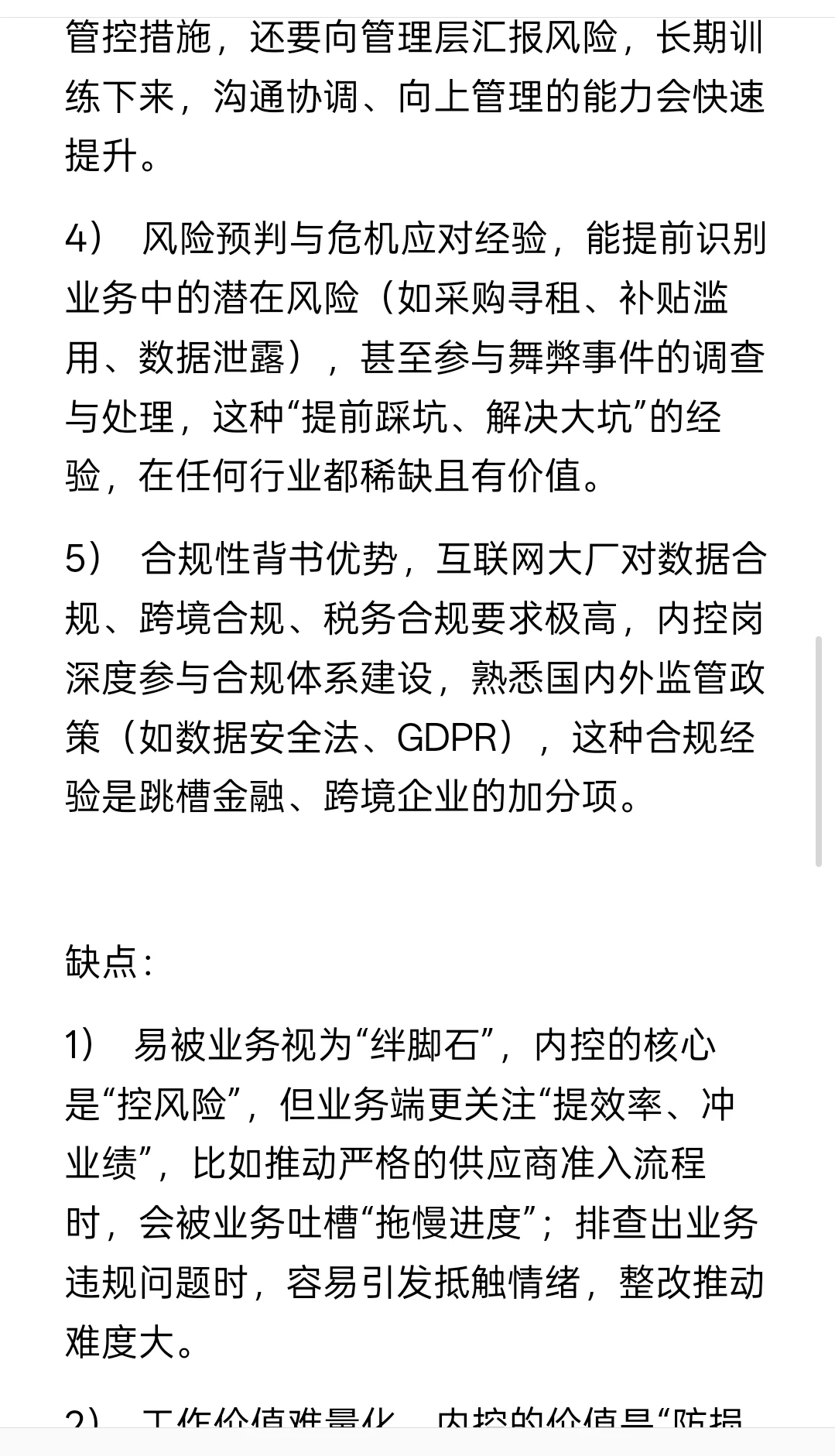 3. 发展历程:在毕马威做了5年内控与合规审计,期间主导过3个大型互联网客户的内控专项项目,考取CPA、CIA后晋升至高级审计。之前在一家中型互联网公司做合规专员1年,因想接触更复杂的业务场景和完善的内控体系,跳槽至头部大厂内控岗,负责电商、直播两条核心业务线的内控体系搭建、风险排查及整改落地。