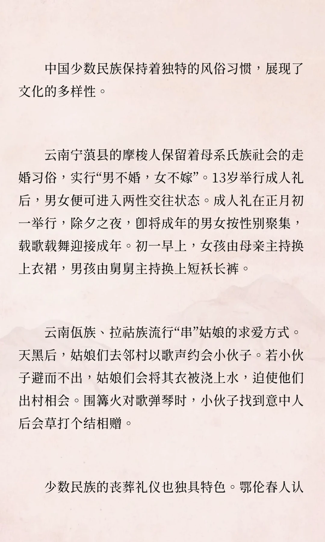 中国北方与南方的风俗传统各具特色,如填仓节、龙抬头、六月六晒衣等,蕴含对丰收、健康和家庭的祈愿。南方的成人礼、端午节习俗展现了独特的饮食与文化。少数民族风俗如摩梭人的走婚习俗、佤族的串姑娘等,体现了文化多样性。