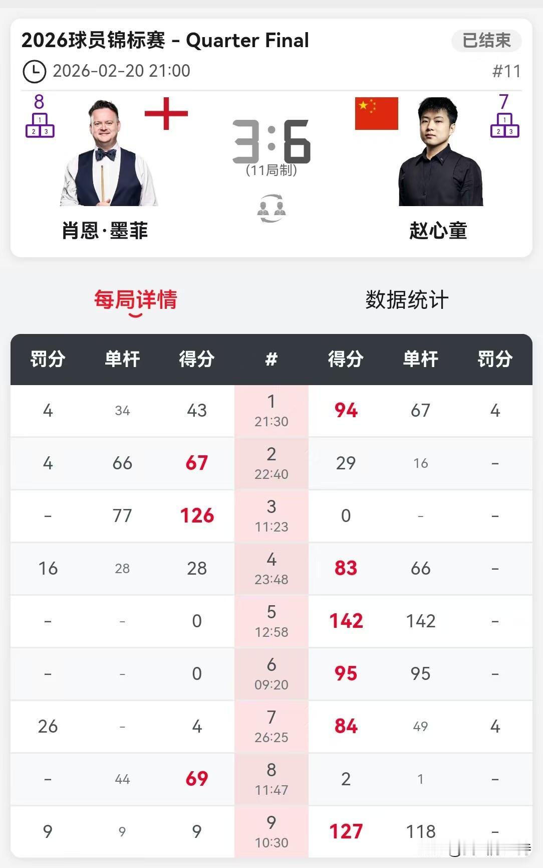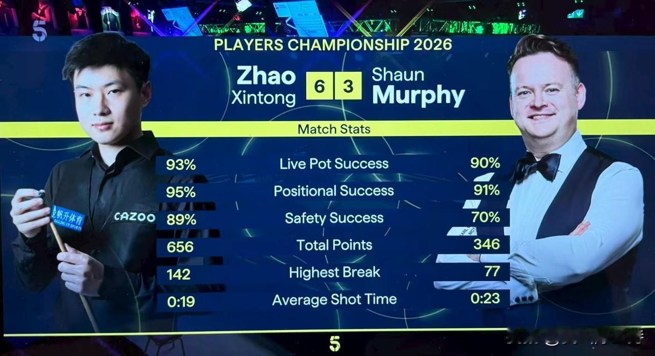 赵心童打出世锦赛冠军级别的比赛,6-3力克墨菲,闯进球员锦标赛4强,下一轮对手是艾伦和塞尔比的胜者。 第一局,墨菲率先上手,失误一杆,赵心童单杆67分拿下。 第二局,赵心童打进长台,贴黄球失误,墨菲单杆66分拿下。 第三局,墨菲架杆失误,赵心童尝试翻袋,可惜给对手留下机会。墨菲单杆77分拿下。 第四局,墨菲失误,留下一个不算简单的长台,赵心童单杆66分拿下,比分来到2-2。 第五局,墨菲防守不可以说不够好,但赵心童打进长台,单杆142分带走比赛。也是本次比赛目前为止的单杆最高分。 第六局,赵心童打出收藏级别的进球,各种高难度进球超越想象,单杆95分带走比赛。 第七局,赵心童凭借坚韧的防守,让墨菲罚了26分,并且单杆49分胜出。 第八局,赵心童强行长台失误,墨菲破釜沉舟,挽回一局。 第九局,墨菲冒险击打组合球,赵心童单杆118分,取得了比赛的胜利。 赵心童本次比赛,进攻犀利,防守稳健。击球成功率、安全球、长台都好过对手,基本可以成为特鲁姆普的对手。