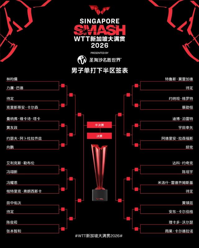 北京时间2月20日,WTT新加坡大满贯正赛签表出炉。作为马年WTT首项乒乓球顶级赛事,本站总奖金高达155万美元,单打冠军可斩获2000点世界排名积分,国乒派出17人豪华阵容全力冲击五冠荣誉。然而抽签结果让球迷直呼“剧本太狠”:国乒首轮就将直面张本智和、张禹珍等强劲对手的围剿,女单则呈现7人扎堆上半区的局面,比赛从首轮就将进入白热化的竞争。