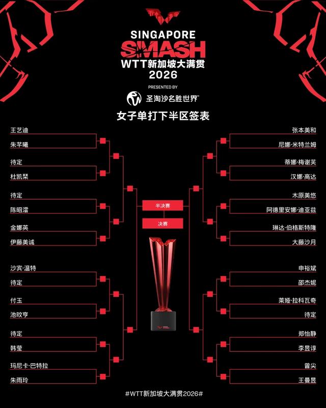 下半区的战局同样紧张激烈,二号种子王曼昱独自扛起防守大旗,首轮对阵新加坡本土选手曾尖,晋级难度不大,但后续考验重重。最受关注的可能是王曼昱与张本美和的再次交手。刚刚结束不久的亚洲杯中,王曼昱在半决赛战胜对手,将双方交手纪录刷新为十战全胜。值得一提的是,张本美和所在的7/8区汇聚了木原美悠、大藤沙月两位日本队友,前者需先从激烈的队内竞争中脱颖而出,才能获得与王曼昱竞争的机会。