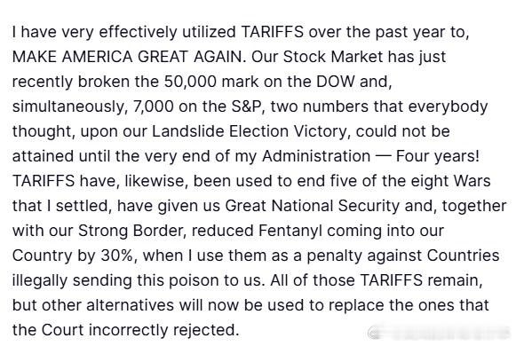 过去一年,我非常有效地利用关税,让美国再次伟大。我们的股市最近突破了道琼斯指数50000点大关,同时标准普尔500指数也突破了7000点。在我们赢得压倒性选举胜利后,所有人都认为这两个数字要到我任期结束——也就是四年——才能实现!