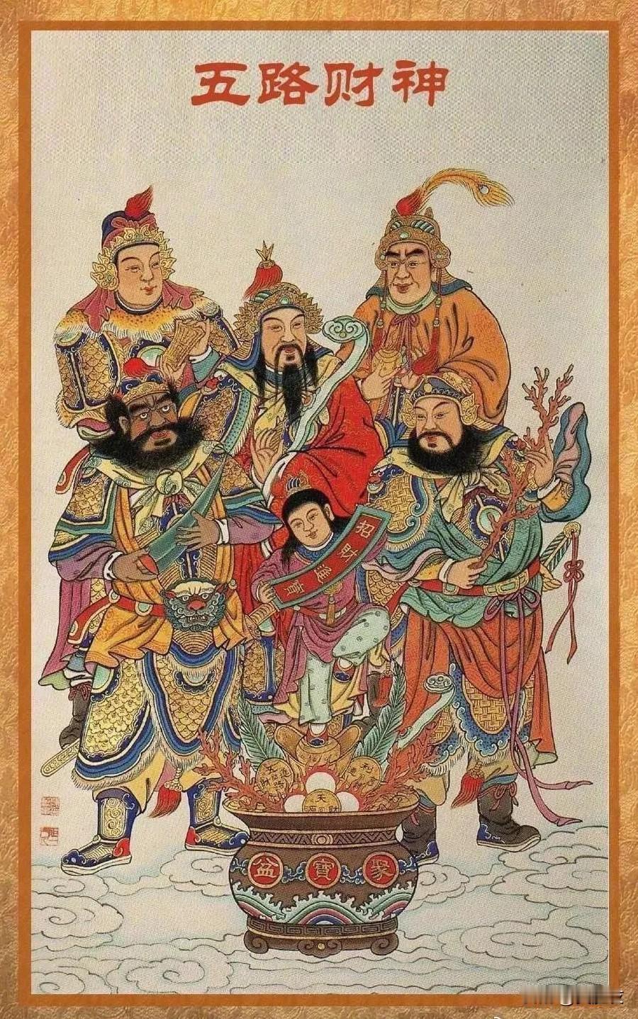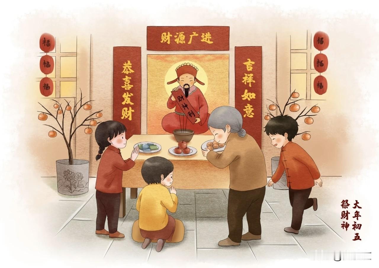 正月初五财神到,接财神。 正月初五子时或凌晨,打开大门和窗户,燃香放爆竹,点烟花,欢迎财神进家门。接过财神,还要喝路头酒,第一杯酒要撒在地上,祈愿在新的一年里大发大富,事业有成。 正月初五接五路财神。 五路财神指的是中路神仙赵公明以及东路财神招宝天尊萧升、西路财神纳珍天尊曹宝、南路财神招财使者陈九公、北路财神利市仙官姚少司。拜五路财神,就是收尽东南西北中五方之财的意思。 初五迎五路财神 正月初五启朱扉,五路神光照紫微。 东路招宝金谷满,西路纳珍玉帛归。 南路招财通四海,北路利市达九畿。 中军元帅赵坛主,福泽绵绵透锦衣。