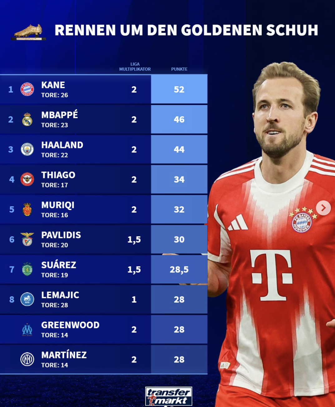 1.凯恩(拜仁):26球x2=52分