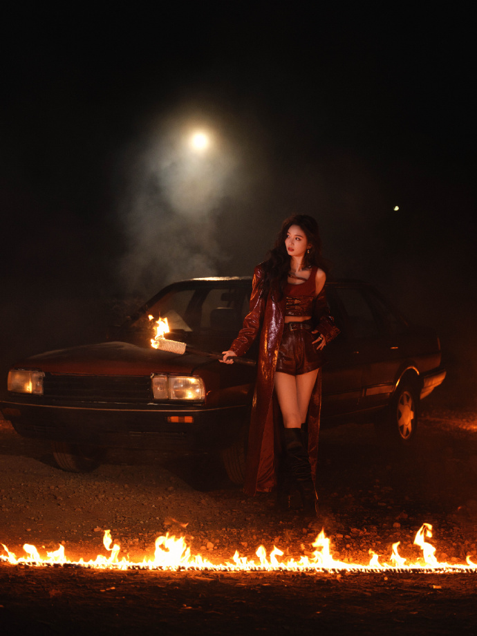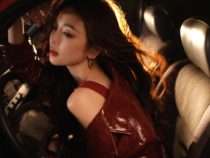 吴宣仪开年玫红皮衣裙装,热烈迷人