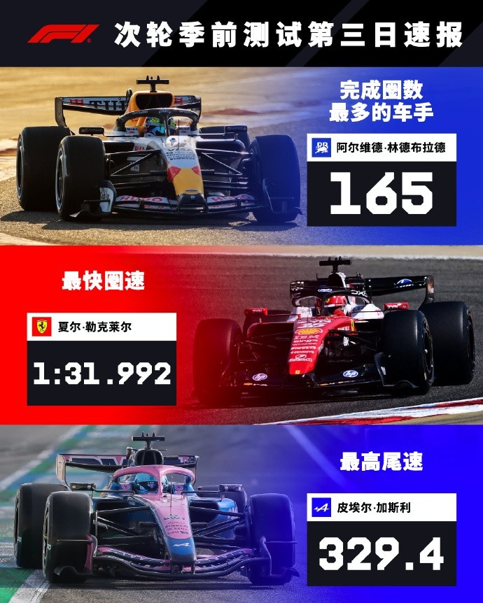 在巴林季前测试最后一日中,勒克莱尔跑出1:31.992的成绩,为最快圈速。小红牛车手林德布拉德以165圈成为完成圈数最多的车手,Alpine车手加斯利以329.4km/h刷新最高尾速。