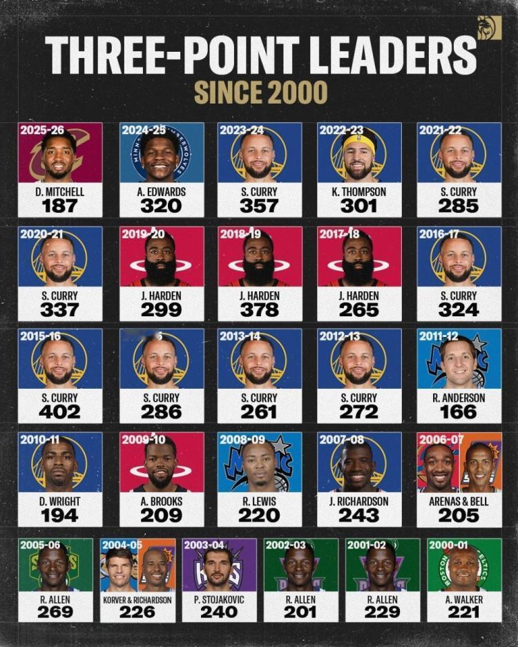 21世纪至今各赛季三分命中数第一人: 单赛季最高:库里,15-16赛季,402个三分 单赛季最低:安德森,11-12赛季,166个三分 历史的转折点就是15-16赛季库里的402个三分球,这一年打破了太多人的认知,三分球开始大行其道。 这一年之前,从未有过单赛季300个三分的故事 这一年之后,至今10个赛季,6个赛季的三分第一,都打破300的门槛,甚至还有哈登299个三分的赛季。 以前单赛季扔进200个,就是联盟第一档的三分投手,现在门槛提高,基本都要达到270个甚至280个以上才行,命中率高,产量也得扛得住。