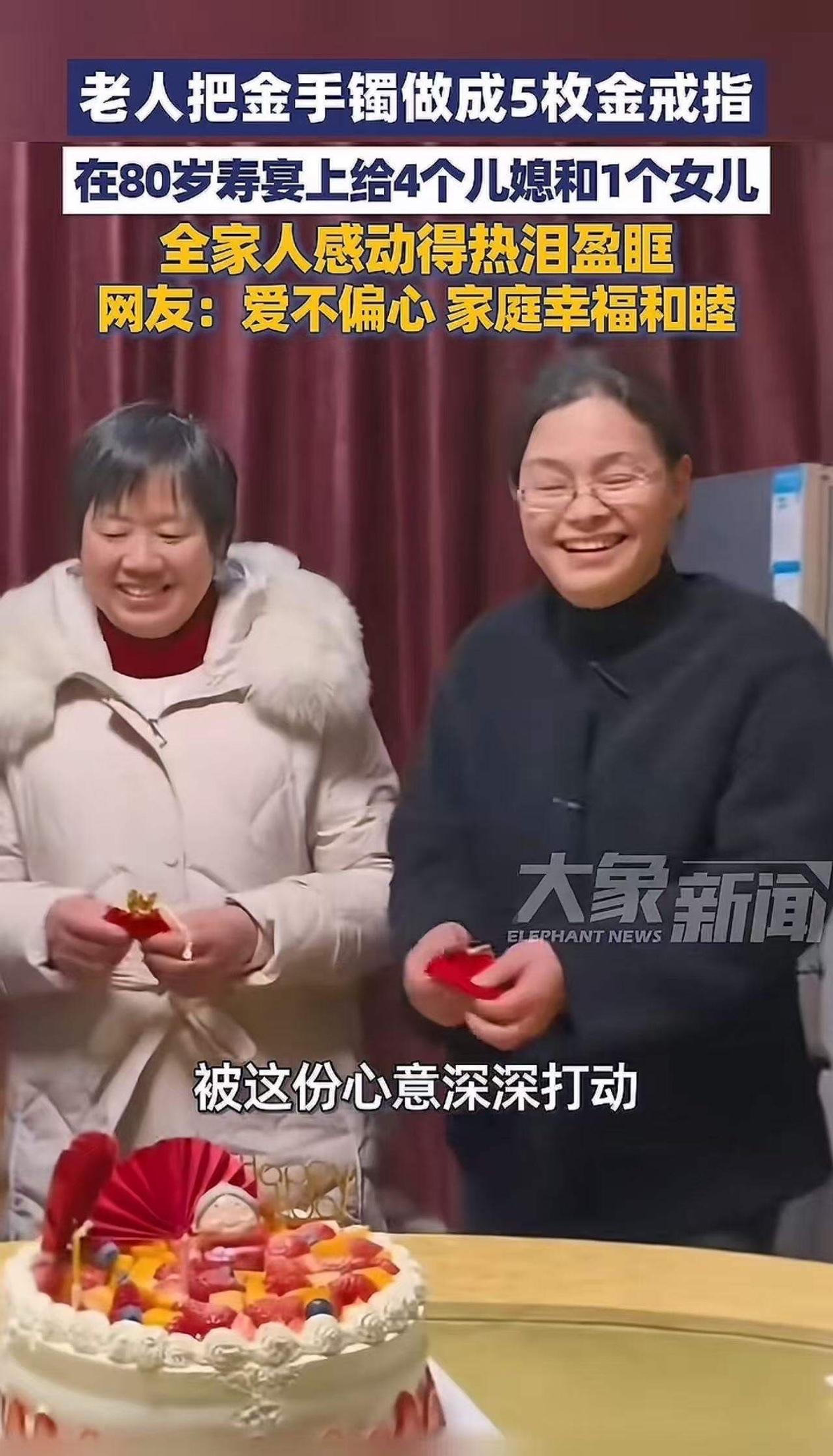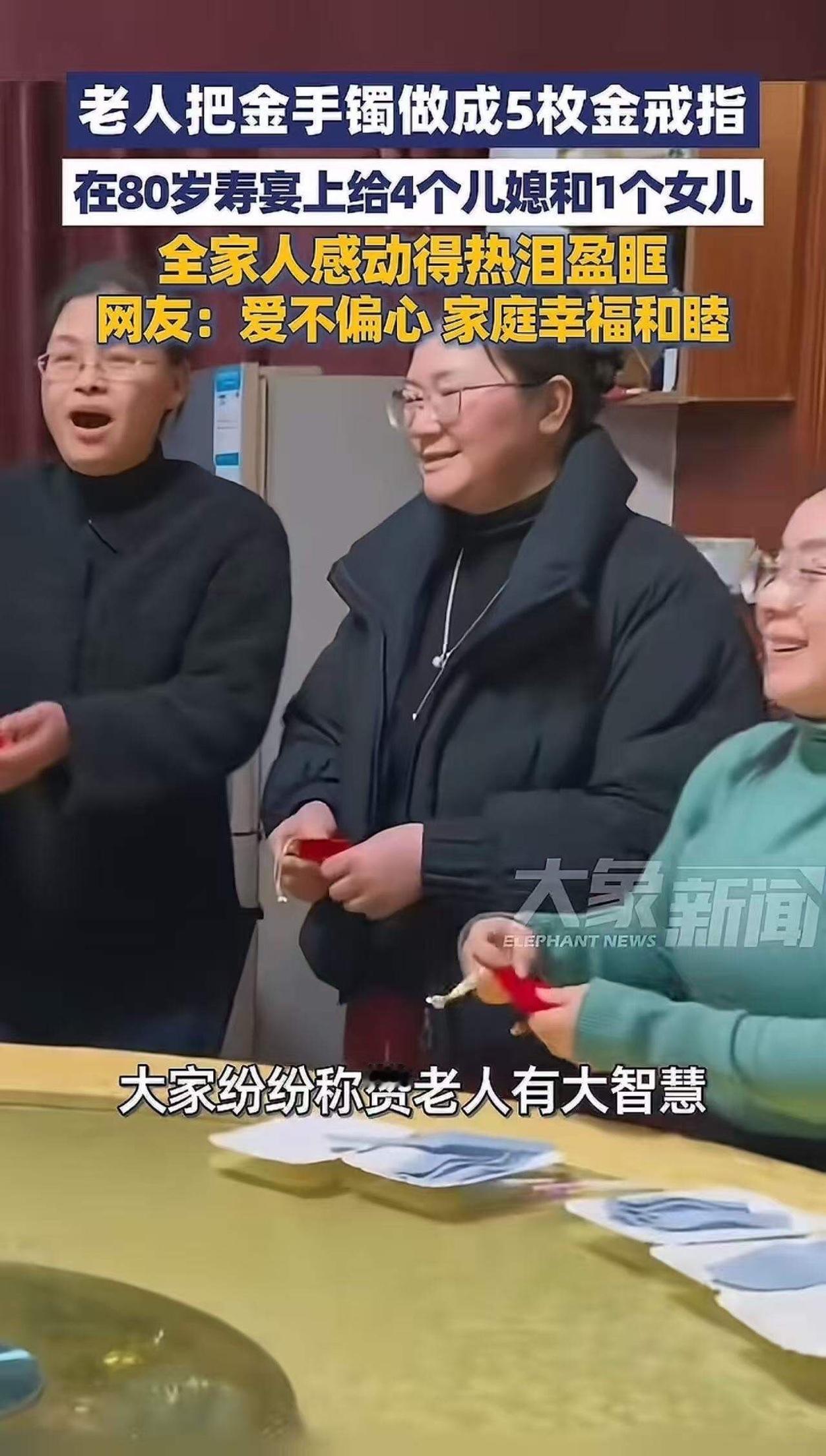 “这老人真是大智慧!”安徽安庆,老人把自己的金手镯做成5枚金戒指,在自己的80岁寿宴上送给4个儿媳和1个女儿!网友:这样的老人,活该她长寿。不偏心的老人长辈是家和万事兴的开始! 这不仅仅是一场简单的寿宴,更像是一场关于爱与智慧的传递。你是否曾经在家庭关系中感受到那种微妙的平衡?有人说,父母的偏心会让孩子心生不满,但这位老人用实际行动告诉我们,真正的爱,是公平,是尊重,是用心的每一份付出。 在这个快节奏、功利至上的时代,许多家庭似乎逐渐失去了那份简单而纯粹的温暖。我们常常忙于追求物质的富足,却忽略了家庭成员间最珍贵的情感纽带。而这位老人,用一枚枚金戒指,传递了一个最朴素却最深刻的道理:爱不在于多,而在于公平与用心。 想象一下,80岁的老人,满头白发,却依然用心良苦。那一枚枚金戒指,代表着他对每一个家庭成员的珍视和祝福。没有偏袒,没有偏心,每个人都能感受到那份来自长辈的公平与关爱。这种爱,或许比任何昂贵的礼物都更温暖、更持久。 而网友们的评论,也折射出社会对这种家庭智慧的认可。有人说:“这样的老人,活该她长寿。”这句话看似简单,却深藏着对家庭和睦的渴望。毕竟,谁不希望在家中感受到那份平等与尊重?谁不希望自己的家庭像这位老人一样,充满爱与智慧的火花? 其实,这样的故事背后,隐藏着一个更深层次的社会意义:家庭的和谐,源自每个人心中的那份善意和公平。我们常常抱怨亲情的冷漠,抱怨家庭的纷争,但是否想过,是不是我们自己在无形中制造了隔阂?家庭的幸福,往往就藏在那些细微的关怀与用心之中。 这位老人用行动告诉我们:偏心或许一时可以获得短暂的满足,但真正的幸福,是来自于公平、尊重和用心的持续积累。家庭成员之间的理解和包容,才是支撑家庭长久和睦的基石。 在现代社会,很多年轻人忙于工作,忽略了父母的感受;一些父母则在偏心中迷失了自己应有的责任。其实,家庭的幸福并不复杂,只需要我们用心去经营,用爱去包容。就像这位老人,用一生的智慧,诠释了什么叫“长辈的爱,是家庭的粘合剂”。 所以,看到这样的故事,你是否也会反思自己的家庭?是不是也该用更多的关心和公平,去温暖身边的人?或许,我们都可以从这位老人身上学到一课:爱,不是炫耀的资本,而是用心的行动;家庭的和谐,不是偶然的奇迹,而是每个人共同努力的结果。 让我们都成为那样的“有智慧”的人,用心去爱,用心去经营,让家庭成为我们心中永远的港湾。毕竟,只有当每个人都能感受到被尊重、被公平对待,家才会真正成为温暖的避风港。这样的家庭,才是真正的幸福源泉,也是真正的长寿之道。寿宴手镯