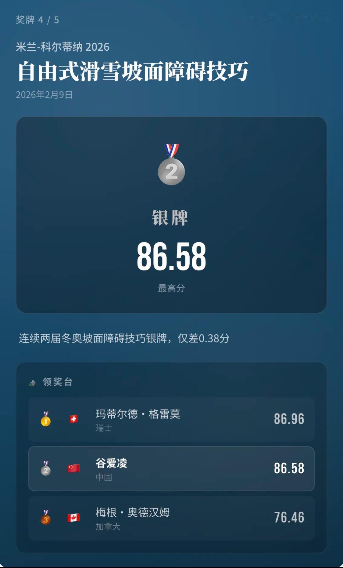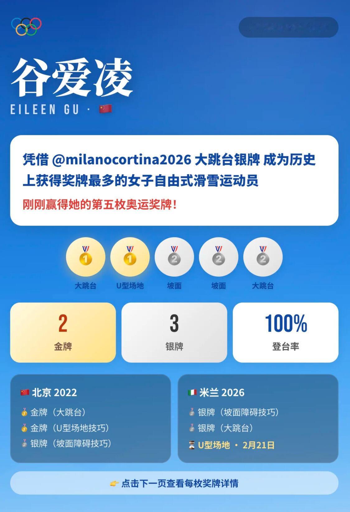 谷爱凌出战冲金5枚奖牌的谷爱凌,真的爱了!谷爱凌在米兰冬奥会女子自由式滑雪大跳台比赛中获得了银牌!这是爱凌在米兰冬奥会获得的奖牌第二枚银牌,同时也是自由式滑雪的第五枚奖牌。谷爱凌成为奥运会女子自由式滑雪项目中获得奖牌最多的选手! ⭐🎿1. 22年北京冬奥会:自由式滑雪女子大跳台 - 金牌(谷爱凌首枚金牌🥇)2. 22年北京冬奥会:自由式滑雪女子U型场地技巧 - 金牌🥇3. 22年北京冬奥会:自由式滑雪女子坡面障碍技巧 - 银牌🥈4. 26年米兰冬奥会:自由式滑雪女子坡面障碍技巧 - 银牌🥈5. 26年米兰冬奥会:自由式滑雪女子大跳台 - 银牌🥈谷爱凌还有U池比赛,对于她的强项是否能冲金,谷爱凌说:“我已经创造了一个冬奥会的纪录——我是女子自由式滑雪历史上获得奖牌最多的运动员,获得了五枚奖牌。”期待她的精彩表现!