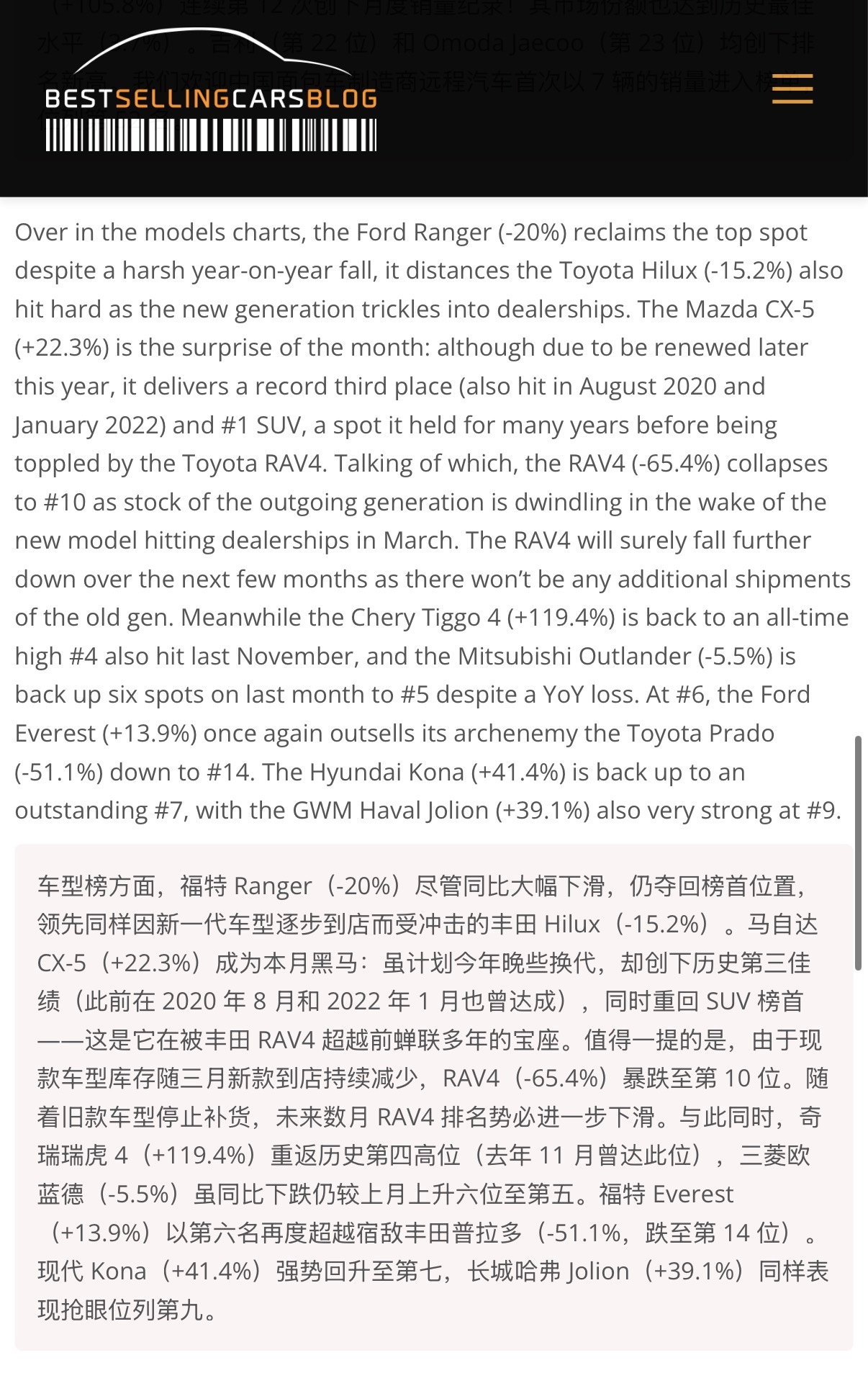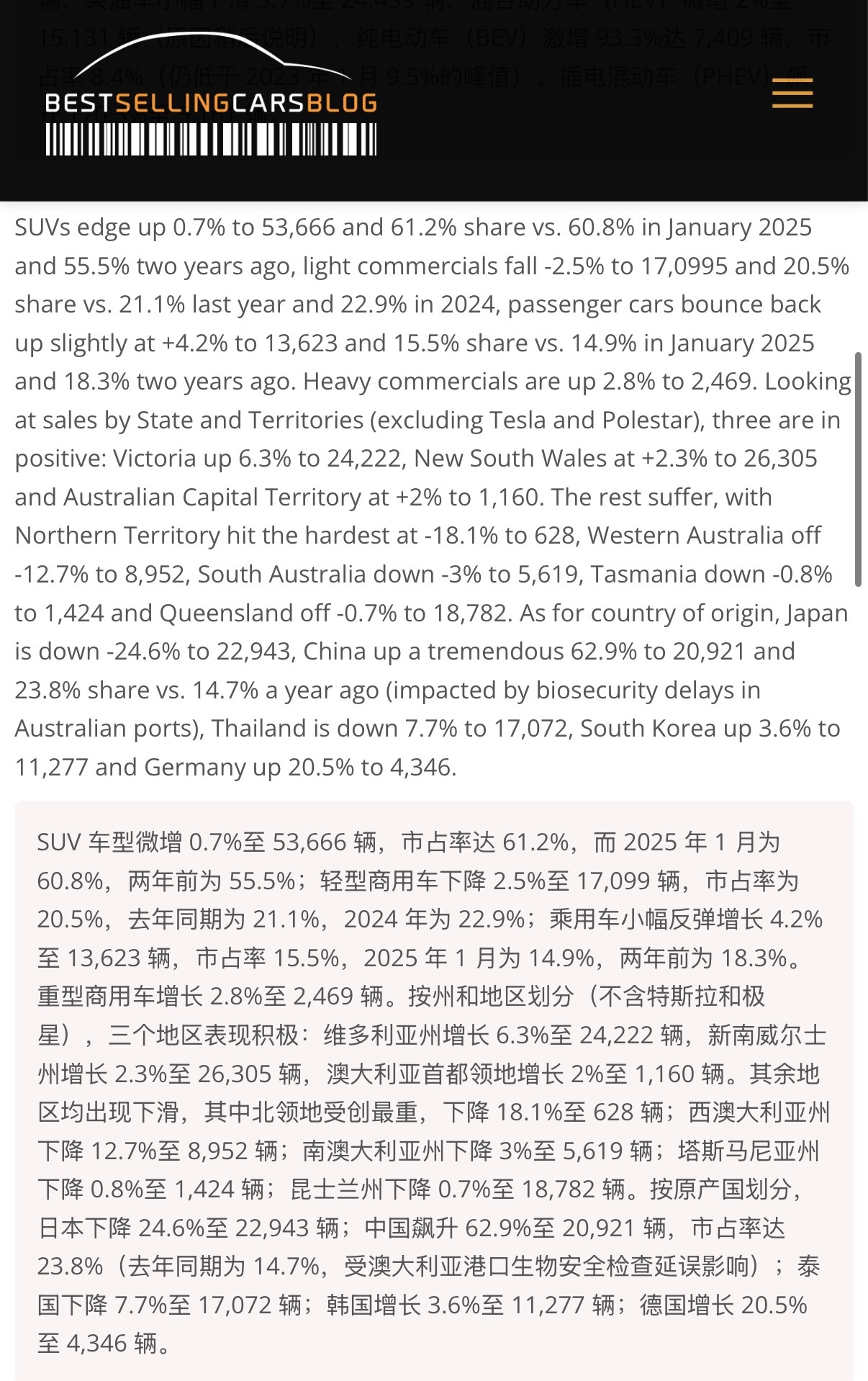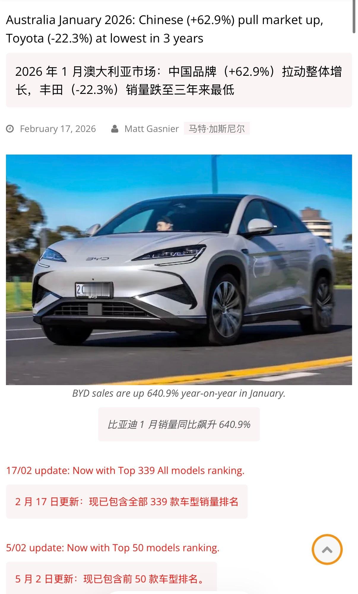 🔻2026 年 1 月澳大利亚汽车市场:中国品牌(+62.9%)拉动整体增长,丰田(-22.3%)销量跌至三年来最低。🔻按原产国划分,日本下降 24.6%至 22,943 辆;中国飙升 62.9%至 20,921 辆,市占率达 23.8%(去年同期为 14.7%)🔻比亚迪 1 月销量同比飙升 640.9%。长城汽车(+31.3%)也表现亮眼,奇瑞(+105.8%)连续第 12 次创下月度销量纪录,其市场份额也达到历史最佳水平(3.7%)。吉利(第 22 位)和 Omoda Jaecoo(第 23 位)均创下排名新高。🔻via bestsellingcarsblog热点现场海外新鲜事