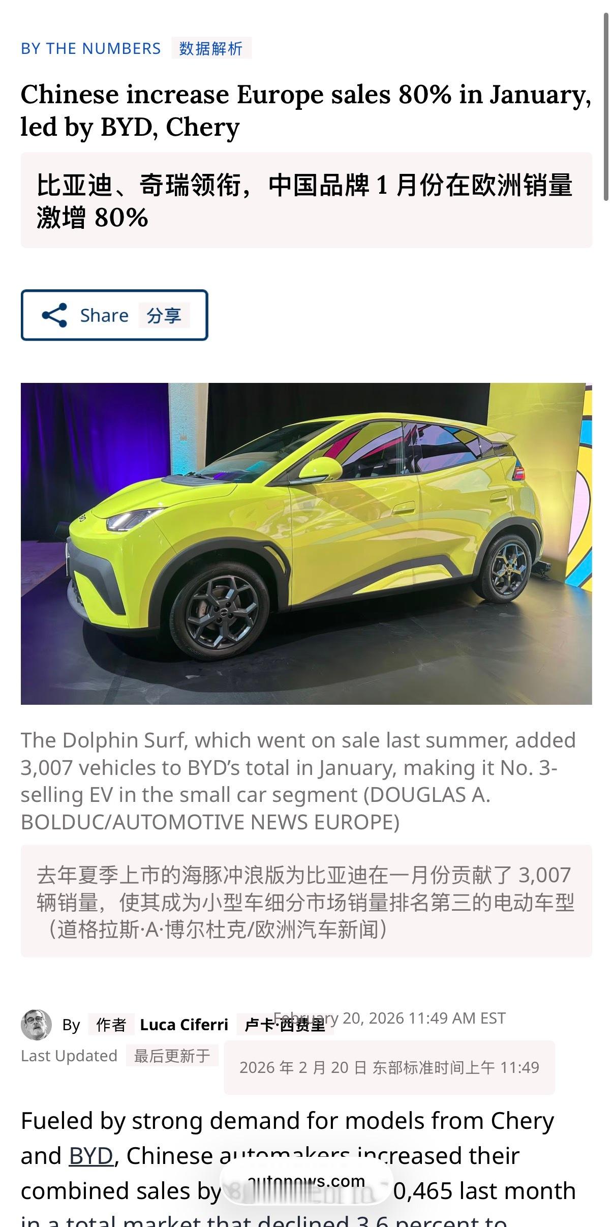 🔻顺着上一贴,补充一个欧洲汽车市场的新闻:🔻欧洲 1 月份汽车销量较 2025 年同期下降 3.6%,其中达契亚、大众品牌、现代和起亚的销量大幅下滑是造成这一放缓的主要原因。相比之下,中国的零跑、比亚迪、奇瑞Jaecoo 和 Omoda等销量实现了三位数百分比的增长。🔻其中,现代下降了20%、起亚下降了19%、特斯拉下降17%、大众下降了11%,而达契亚竟然下降了35%,销量减少约 16,513 辆,几乎占据市场总下滑量的一半。🔻中国车企却逆势而上,零跑汽车交付量达 4,249 辆,同比增长 408%(由 B10 SUV 等车型驱动),奇瑞Jaecoo +365% 至 7,193 辆,奇瑞欧Omoda 同比增长 197%,销量达 6,596 辆,比亚迪同比增长 173%,销量达 17,630 辆。🔻去年夏季上市的海豚冲浪版为比亚迪在一月份贡献了 3,007 辆销量,使其成为小型车细分市场销量排名第三的电动车型。🔻2026 年 1 月 MG 销量达 18,537 辆,较 2025 年 1 月的 19,269 辆略有下滑(小幅下降)。MG 仍是中国品牌销量冠军,以约 907 辆的微弱优势领先比亚迪。🔻在奇瑞和比亚迪车型强劲需求的推动下,中国汽车制造商上月在欧洲整体销量同比增长 80%,达到 70,465 辆。🔻欧洲柴油车销量在电动化进程中持续收缩(ACEA 数据的长期趋势)。随着消费者偏好和法规政策逐渐远离纯柴油车型,插电混动车及其他电气化选项正不断抢占市场份额。中国品牌(在纯电动车、插电混动车及高性价比电气化车型领域优势显著)从这一转型中获益颇丰。🔻via Automotive News Europe 热点现场海外新鲜事