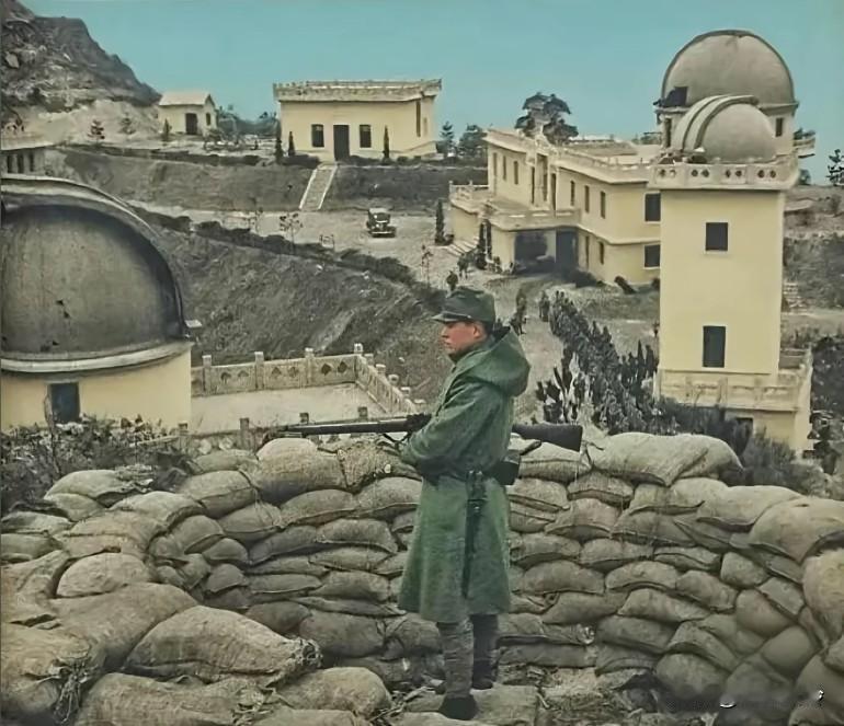 日军占领南京紫金山天文台的历史照片,拍摄于1937年12月南京沦陷后,由日本随军记者记录 照片中,一名日军士兵持枪在天文台前站岗,背景可见天文台建筑群及沙袋工事,下方还有列队行进的日军小队,真实再现了日军占领南京后在重要战略高地设防的情景。 当时日本小学都要参加一定的军事训练,就连小孩日常娱乐都是学习步兵冲锋。而一名新兵每个月射击不得少于150发,一年不得少于1000发步枪子弹,神枪手那都是靠子弹喂出来的。相比同一时期的民国,一名军人从参军到阵亡都不一定能打完150发子弹。 日本鬼子就会搞偷袭,日本这个畜 生国家没有人性可言。跟俄罗斯也打了,然后几十万日本鬼子,连内裤都没有穿,就被拉到东北去种土豆去了,死的死,残的残。