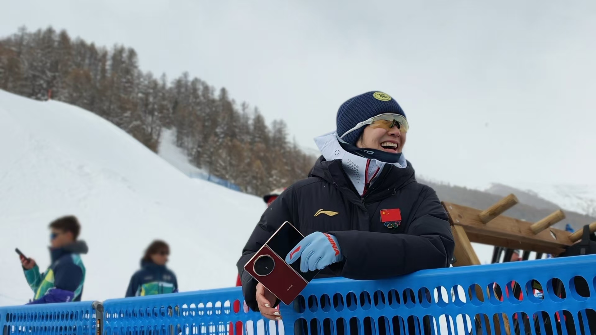 "徐梦桃在米兰赛场彻底火出圈了!用一部红色折叠屏手机,亲手拍下老公王心迪夺冠的瞬