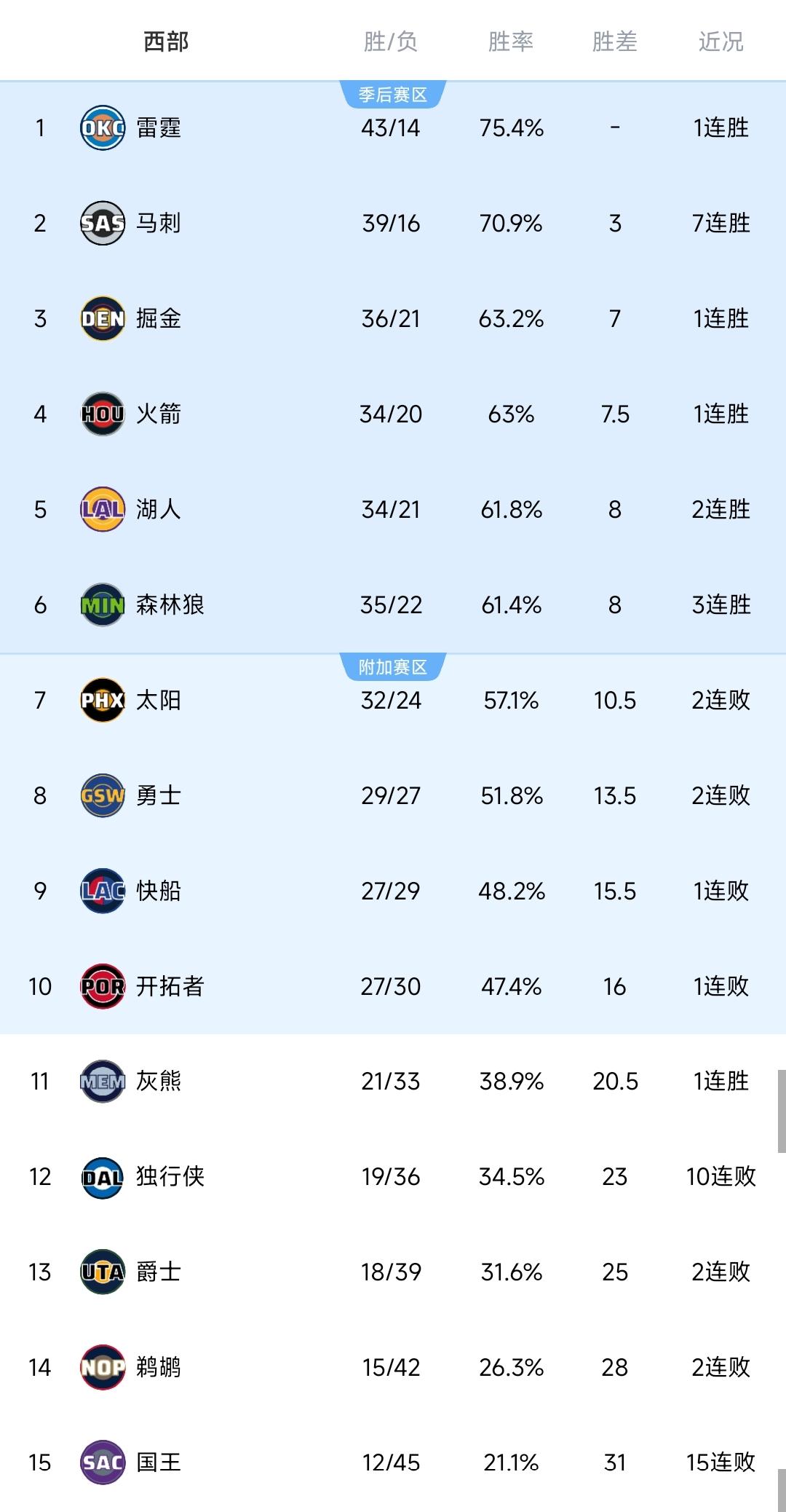 NBA西部最新排名! 湖人力克快船,仍居西部第五! 掘金54分大胜,反超火箭夺回西部第三! 北京时间2月21日,NBA常规赛激战正酣。 ①森林狼122-111击败独行侠,首节火力全开狂轰40分奠定基调,戈贝尔统治内线,爱德华兹独揽大旗,替补席还有里德提供输出,他们绝大部分时间都能保持稳定输出,面对反扑也从容化解危机,最终顺利告捷,一波三连胜,守住西部前六的位置。爱德华兹30次出手贡献40分,且只有4次罚球。 ②掘金157-103狂胜开拓者,彼此阵容实力存在一定差距,约老师以身作则是带队前进,内外开花,表现尤为高效,穆雷同样稳定输出,其余队友也相继提供支持,于是早早拉开两位数,上半场的优势接近30分,几乎很快失去悬念,最终收获一场54分的大胜,全队命中21次三分且命中率超过五成。杨瀚森替补出战8分钟,投篮4中1,罚球6中2得到4分1板。 ③湖人125-122力克快船。洛杉矶德比没有让球迷失望,比赛过程是尤为激烈,湖人前程势头凶猛,外线手感火热下起三分雨,东契奇领衔打出高效的进攻。快船毫不示弱,在伦纳德带领下还以颜色,逐渐展开精彩的缠斗。第四节的竞争更是精彩,相互回应,最后阶段伦纳德左脚踝伤退或成为转折,湖人有惊无险顶住压力,斯玛特关键时刻相当强硬,东契奇又是一场38分+11助攻的超神表演。