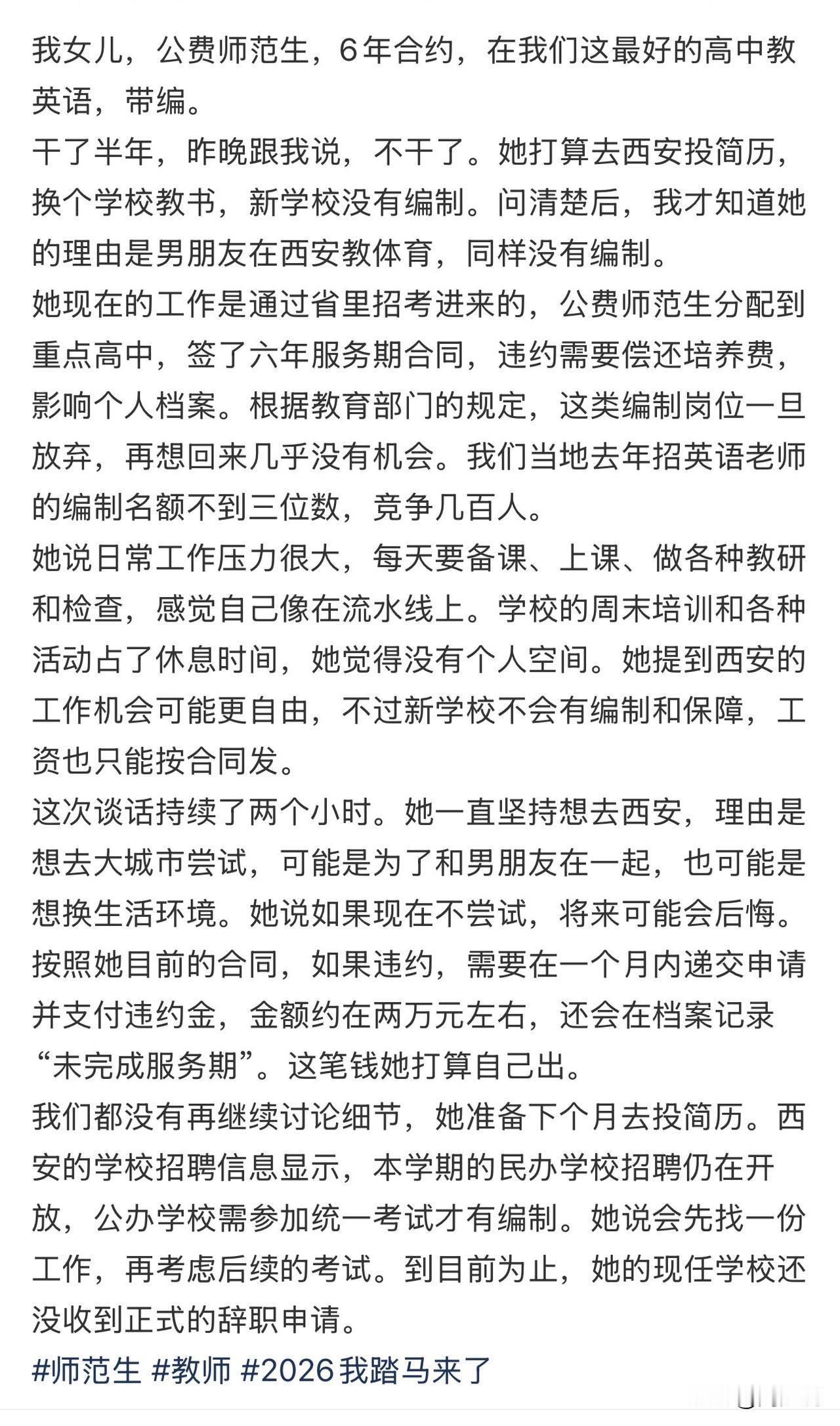 “真是身在福中不知福!”福建一位妈妈的吐槽,引发热议。女儿是公费师范生,顺利进入当地最好的高中教英语,带编制,还签了六年服务期,这份工作是无数人挤破头都想争取的。可昨晚,她平静地告诉我,要辞职去西安,投奔同样无编的体育老师男友,放弃编制,甘愿承担违约金。 同时,她坦言:重点高中节奏紧绷,备课、教研、各类检查连轴转,几乎没有私人空间,而西安的生活,或许能多几分自由。可一旦违约,两万违约金事小,档案留下记录,再想重回编制岗位,难度可想而知。 此话一出,网友们看法不一。有人心疼父母,觉得稳定胜过一切;也有人理解年轻人,不想被安稳困住一生。 在周少看来,年轻人向往远方与爱情,这份勇气不难理解,可安稳的编制,是现实里最踏实的保障。虽然理想和爱情固然珍贵,但也不该轻易丢掉多年努力换来的底气。 总而言之,周少认为做选择前,应该多几分理性考量,别让一时的冲动,埋下日后遗憾的种子。人生没有回头路,每一步,都值得细细斟酌。#寻美三湘# #周少说教育#