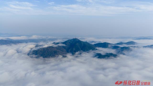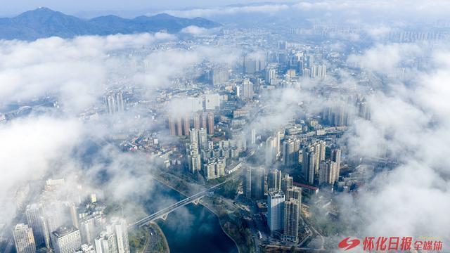 (2月20日清晨,怀化多地被大雾笼罩。图为城区中坡山。)