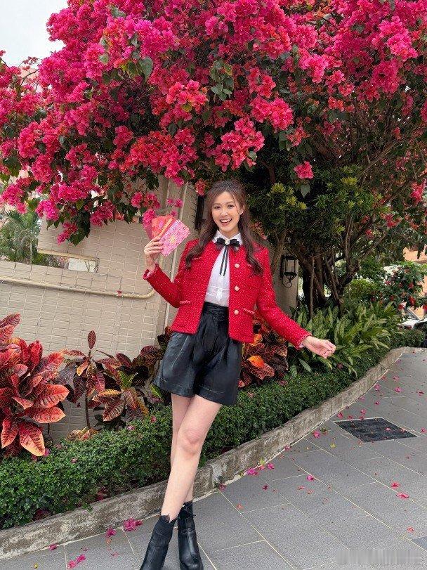 藝人劉佩玥(Moon)近年備受力捧,過去一年忙碌拍劇的她,趁住農曆新年放假休息,跟親朋好友拜年相聚。Moon於社交網晒靚相跟網友拜年,穿起鮮艷紅色外套配黑短褲的她,手執利是大晒長腿,在身後同樣「紅噹噹」的鮮花伴襯下,充滿節日氣息。