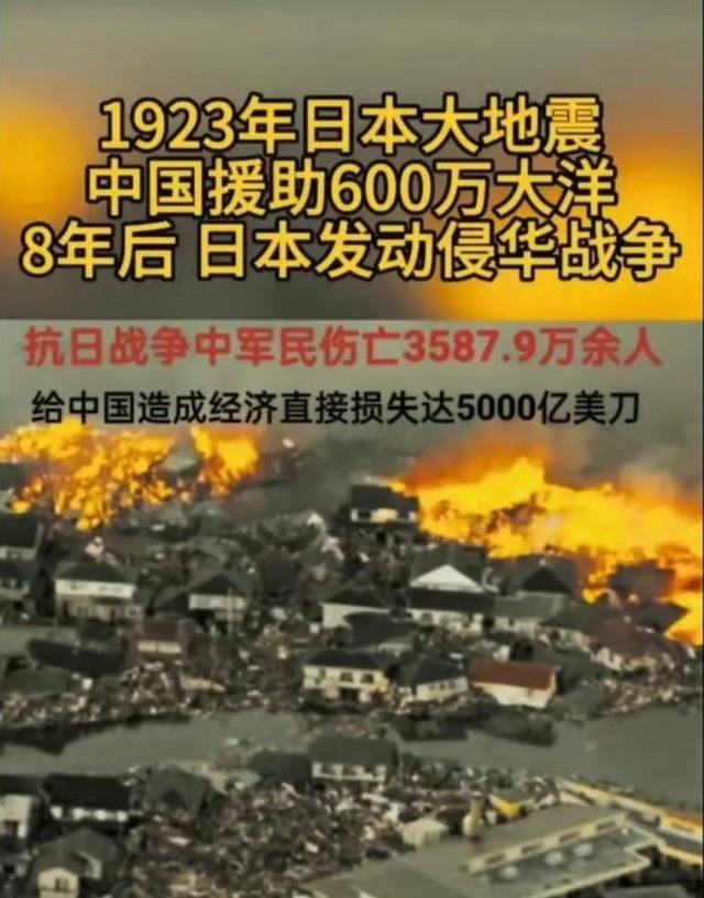 日本就是一个恩将仇报,以怨报德的民族。 1923年日本大地震,中国援助600万大洋。 8年后,日本发动侵华战争。 抗日战争中军民伤亡3587.9万余人,给中国造成经济直接损失达5000亿美刀。 我们以德报怨,他们以怨报德,善良永远改变不了恶人! 援助之后,日本却选择侵略路径,这段历史隐藏着怎样的转折?援助物资抵达时,日本内部军阀势力已开始扩张,八年后的战争是否早有预谋? 1923年9月1日,日本关东地区发生大地震,震级7.9级,东京和横滨遭受重创。灾区死亡超过14万人,数十万人受伤。北洋政府迅速响应,拨款20万元援助,并免除出口关税。上海总商会购办面粉一万包、米三千包,成为首批国际援助。中国红十字会派医疗队抵达灾区,提供救援。 援助总额约600万银元,包括民间捐款。梅兰芳义演筹集5万元。北洋政府命令各省筹款,运米30万石到日本。孙中山广州政府也参与捐助。援助物资通过轮船运抵,帮助重建。但日本接受援助后,内部军国主义增强。 1931年9月18日,日本关东军在柳条湖自爆铁路,指责中国军队,进攻北大营。东北军执行不抵抗命令,沈阳次日陷落。日军推进,占领长春和吉林。东北全境于1932年2月沦陷,日本建立伪满洲国,控制资源。 1937年7月7日卢沟桥事变,日本全面侵华。日军占领北平和天津。淞沪会战中国军队抵抗三月,牺牲数十万。南京沦陷后,日军屠杀30万人。武汉会战中国部队设防长江,日军付出代价但获胜。战争八年,中国组织22次大会战。敌后游击作战消耗日军。日军推行三光政策,导致饥荒。中国军民伤亡3587.9万,军队阵亡380万。直接经济损失1000亿美元,间接损失5000亿美元。