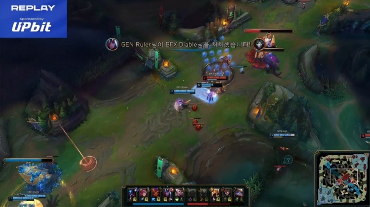 [20:42]GEN继续中路抓Diable烬得手,Chovy岩雀开车直接击飞Diable打出后者闪现将其融化,双方打野互换,Ruler韦鲁斯拉弓射箭爆轰三杀,GEN打出2换5团灭BFX,经济领先5k。