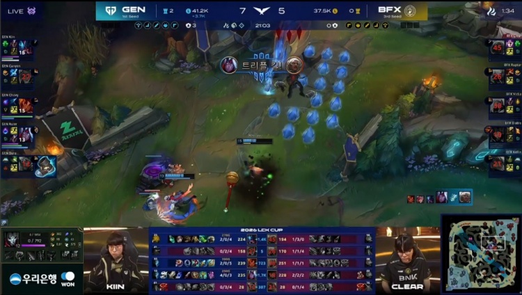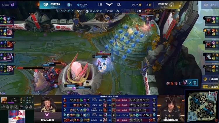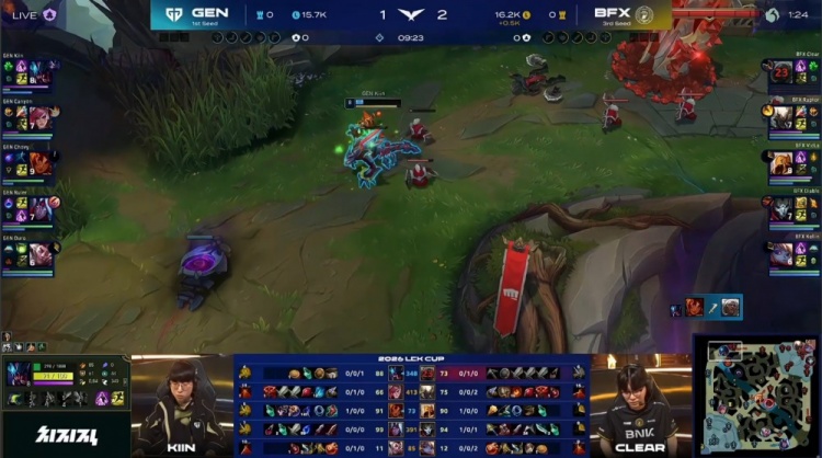 第一局前期BFX入侵下野区击杀GEN野辅,VicLa沙皇和Diable烬收下人头。随后Chovy岩雀配合Kiin雷克塞两次越塔击杀Clear安蓓萨,GEN经济领先1k。