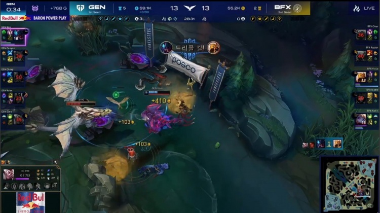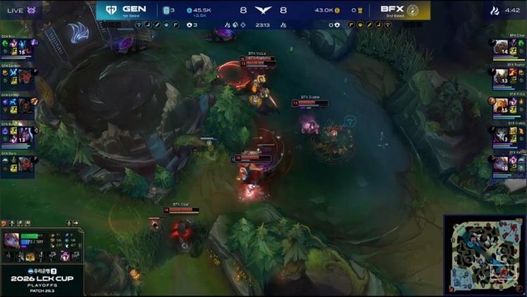 后期上河道团Raptor潘森复活甲起身被击杀,GEN打出0换2拿到大龙,经济领先5k。龙魂团x2,Chovy岩雀抬BFX三人,Kiin雷克塞三杀,双方4换4,Ruler韦鲁斯复活后拿到风龙魂。最终GEN再进BFX野区击杀Raptor潘森与Kellin波比,一波推平BFX基地先下一城。
