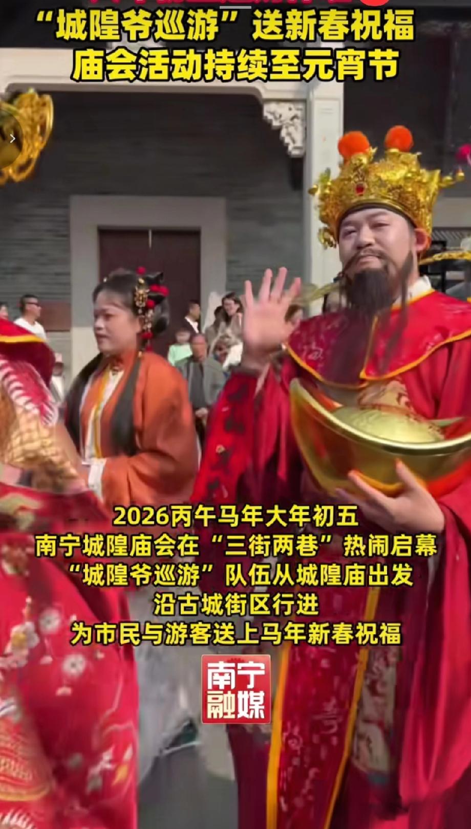 今天(2月21日,正月初五)南宁三街两巷超热闹的“迎财神”在城隍庙这里火热进行巡游从城隍庙出发,沿着古城街区(三街两巷范围内)行进。整个城隍庙会将一直持续到元宵节,这期间去三街两巷都能感受到这份年味。(来源于@南宁融媒)