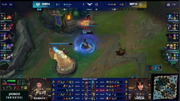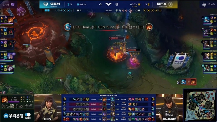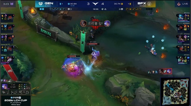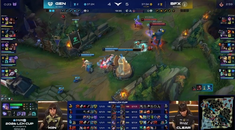 [19:36]Clear格温下路推线被GEN上野逮捕击杀,Clear大人头送给Kiin纳尔,BFX随后三人上路越塔击杀Chovy梅尔,双方打出1换1。