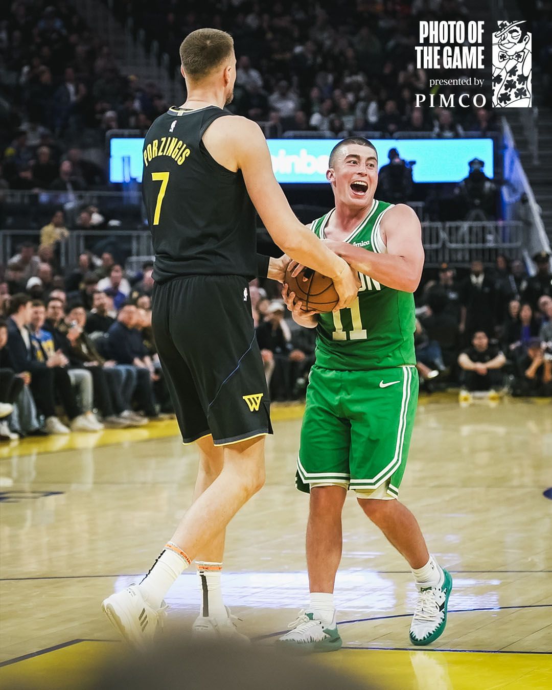 虎扑02月21日讯凯尔特人官方更新Ins,晒出一张凯尔特人球员佩顿-普里查德和勇士球员克里斯塔普斯-波尔津吉斯的赛场合影与球迷分享。