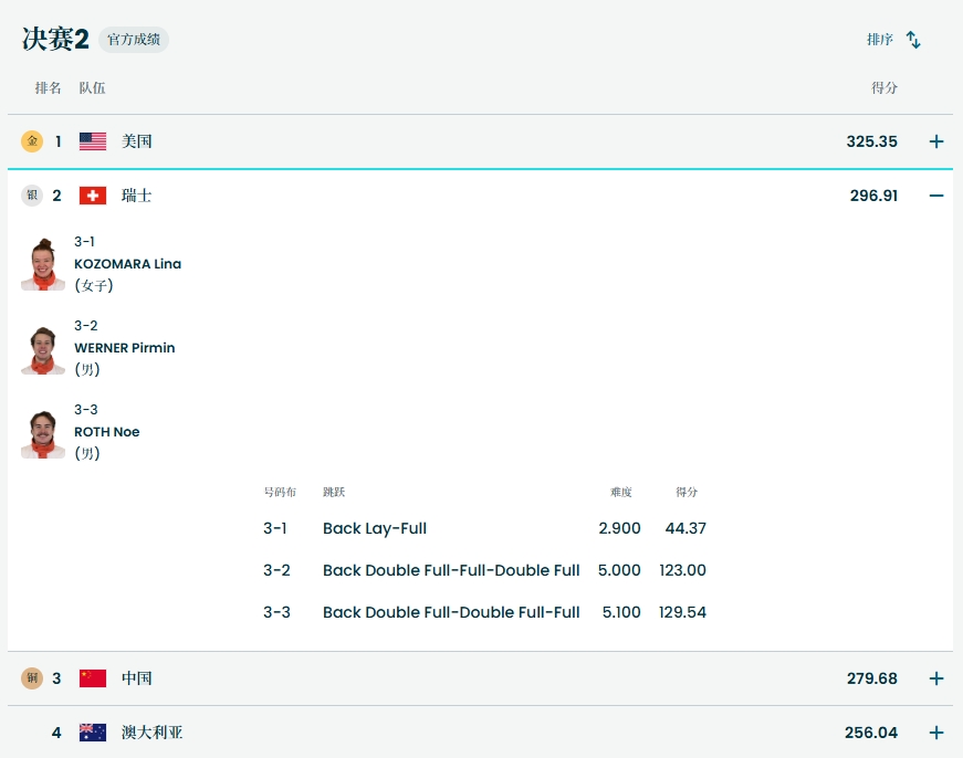 直播吧02月21日讯米兰冬奥会自由式滑雪空中技巧混合团体决赛,美国队卫冕夺金,瑞士队银牌,中国队铜牌。
