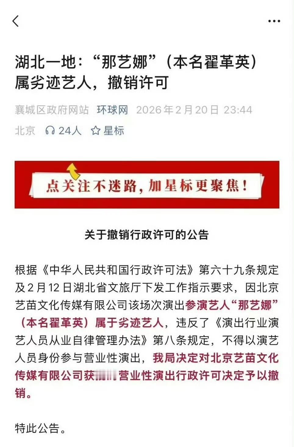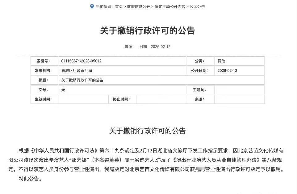 这是今天娱乐圈最大丑闻! “假唱+假人设,网红那艺娜演艺梦被官方叫停,究竟经历了啥?” 2月21日,圈里突然炸锅,那艺娜演出彻底被叫停。湖北襄城区行政审批局直接发布公告,把她认定为“劣迹艺人”,按照湖北省文旅厅2月12日发正式定性,撤销了她在襄阳的营业性演出许可,原本计划的演出当天全部泡汤。这下,全国各地巡演计划都卡住了。之前那艺娜一脸自信,说要去鸟巢开唱,结果现在风头完全没了。 其实这事真不是一夜之间发生的。那艺娜这一路,几乎步步踩雷。她一开始在短视频平台上搞“俄罗斯娜娜”的账号,靠AI特效虚构“中俄混血大妈”形象拼命吸粉。结果网友发现她中文很别扭,口头禅是“我爱中国”,但人设纯粹在装。带货卖的“俄罗斯特产”其实都是国内代工的假货。央视都点名说她扰乱网络秩序,抖音直接封禁账号,别说真粉了,路人都看不下去。 换个名字继续混,换了马甲叫“那艺娜”,靠几首土味神曲又火了一把。她搞全国巡演,门票还一度抢光。可是到杭州演唱会现场,直接被揭穿全程假唱,还伴奏里飘着童声,有人当场喊退票,完全尴尬。更离谱的还是那场湖北钟祥的跨年歌会,竟然请了涉毒的东来东往和“劣迹艺人”谢孟伟来做嘉宾,把红线踩得明明白白。 到了2026年初,她团队还高调宣传襄阳演出已经搞定,炒作什么“人气爆棚”。可刚到演出前一周,湖北省文旅厅发了定性文件,襄城区审批局马上撤销许可。她的工作室本来还嘴硬说“演出准备正经进行”,结果等官方公告一出来,所有说辞都没戏了。法律效力摆在那儿,谁都挡不住。 那艺娜一路靠炒作、骗人设、假唱、售假货来挣流量,结果没撑住。她被认定为“劣迹艺人”,演出计划全面告吹,演艺梦直接碎了。这件事不仅是她自己的翻车事,还算是对整个演艺圈的一个警告——要是想靠撒谎走红,最后只会被监管和市场一起拦下来。