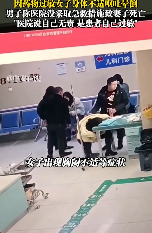 报道视频显示,刚挂水4秒,女子出现胸闷等身体不适症状,并开始呕吐,护士过来看了一眼就离开,在过去4分钟后护士和护工才拿来了担架,但此时女子已经晕厥,并最终死亡。女子丈夫表示,医院没采取急救措施致妻子死亡,错过黄金救援四分钟。