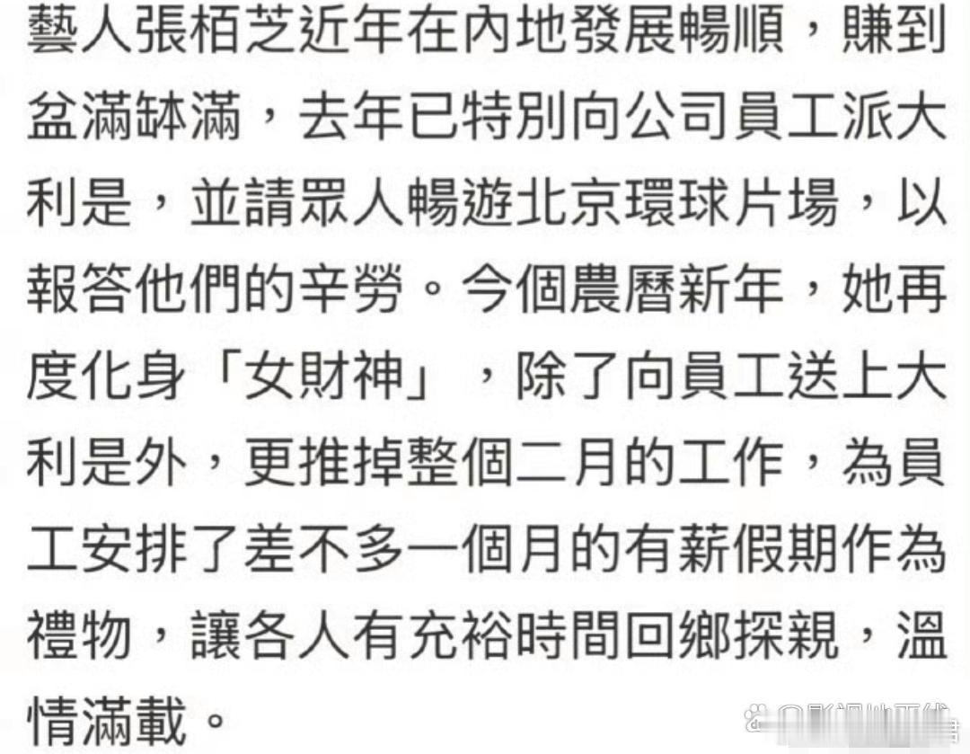 据港媒,张柏芝今年过年不仅给员工准备了大红包,还给员工安排了差不多一个月的带薪休假,让大家有充足时间回乡探亲。