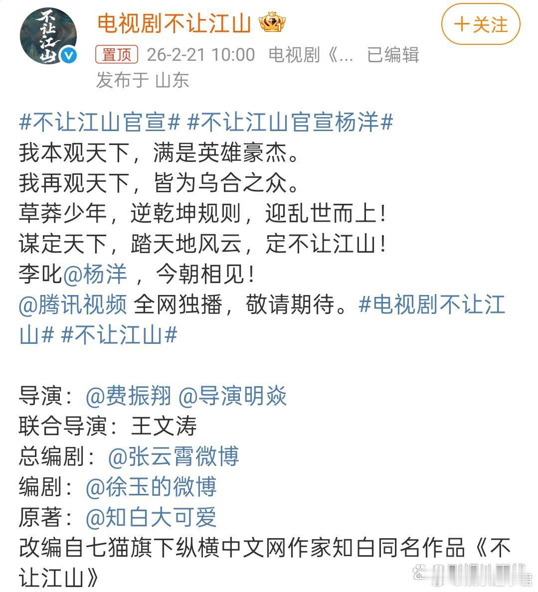 《不让江山》官宣阵容,杨洋的主演,费振翔的导演,看起来挺不错。