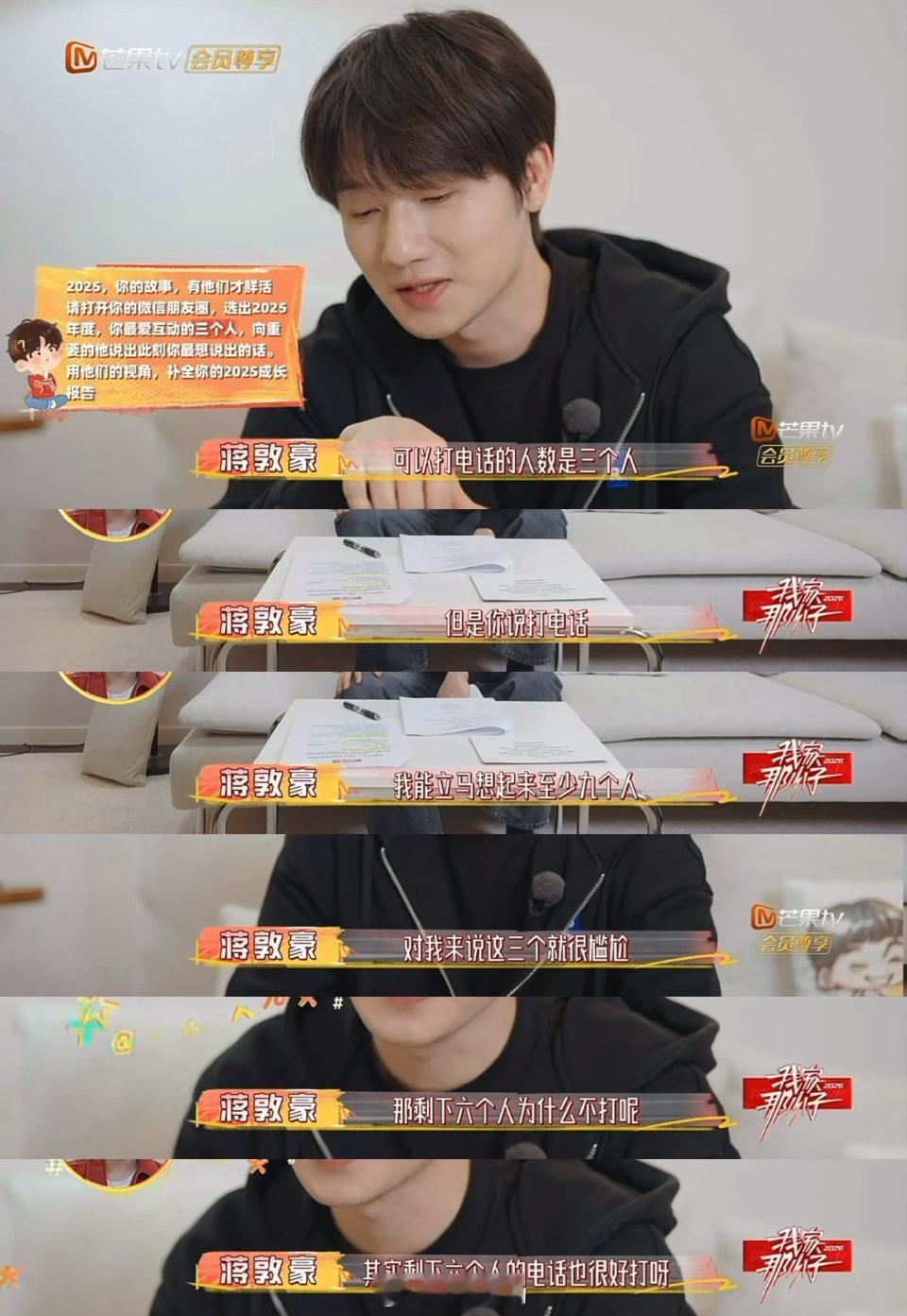 十个勤天其他八个人可以闹了我家那小子 蒋敦豪电话环节心里蹦出九个兄弟,结果只能打给三个人,最后独宠王一珩一个,这碗水洒得也太彻底了。