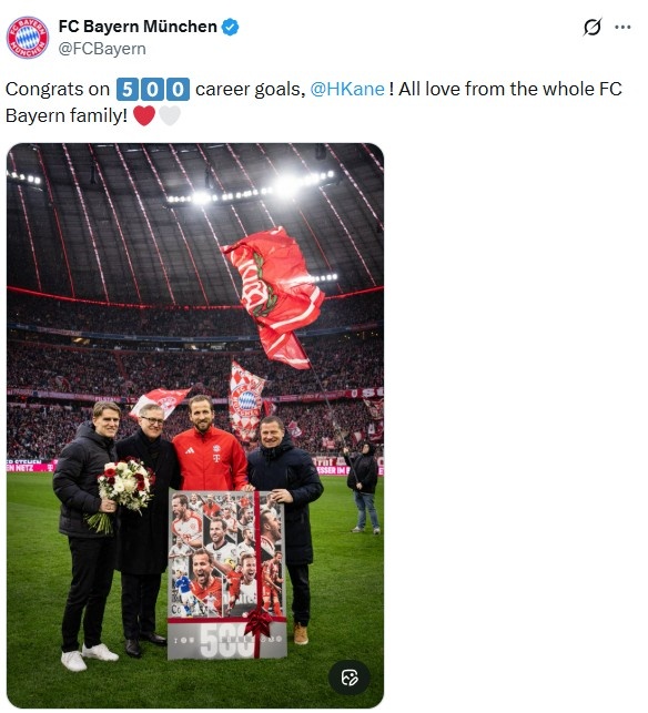 拜仁官推也晒出凯恩与球队高层的合照,配文写道:“祝贺凯恩达成生涯500粒进球里程碑,拜仁大家庭永远爱你!”