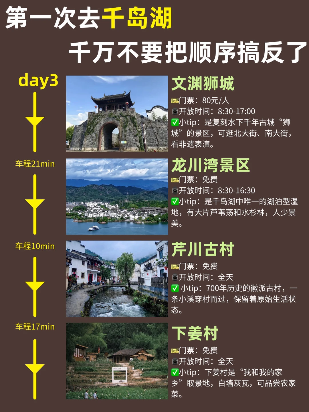 路线:文渊狮城 → 龙川湾景区 → 芹川古村 → 下姜村/千岛湖大桥夜景