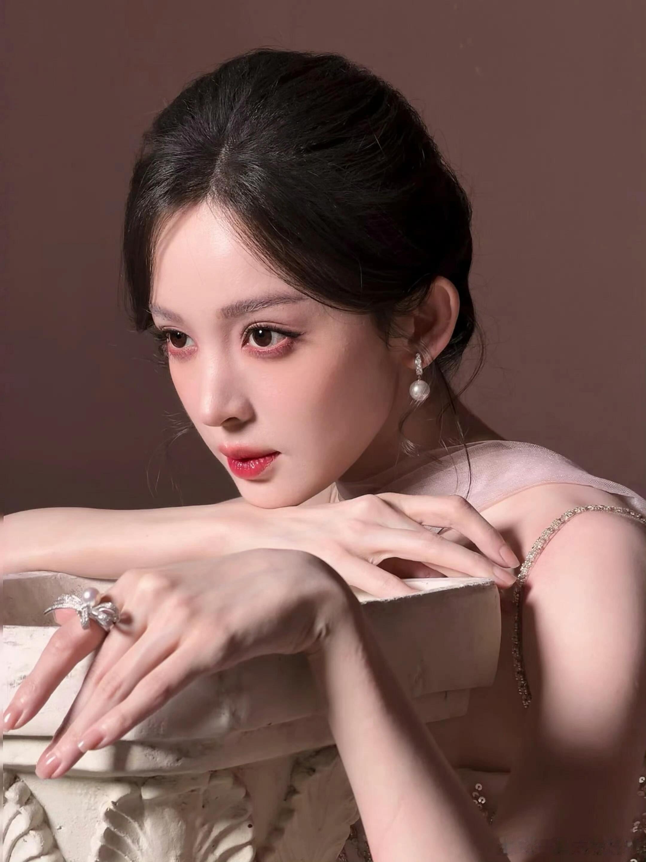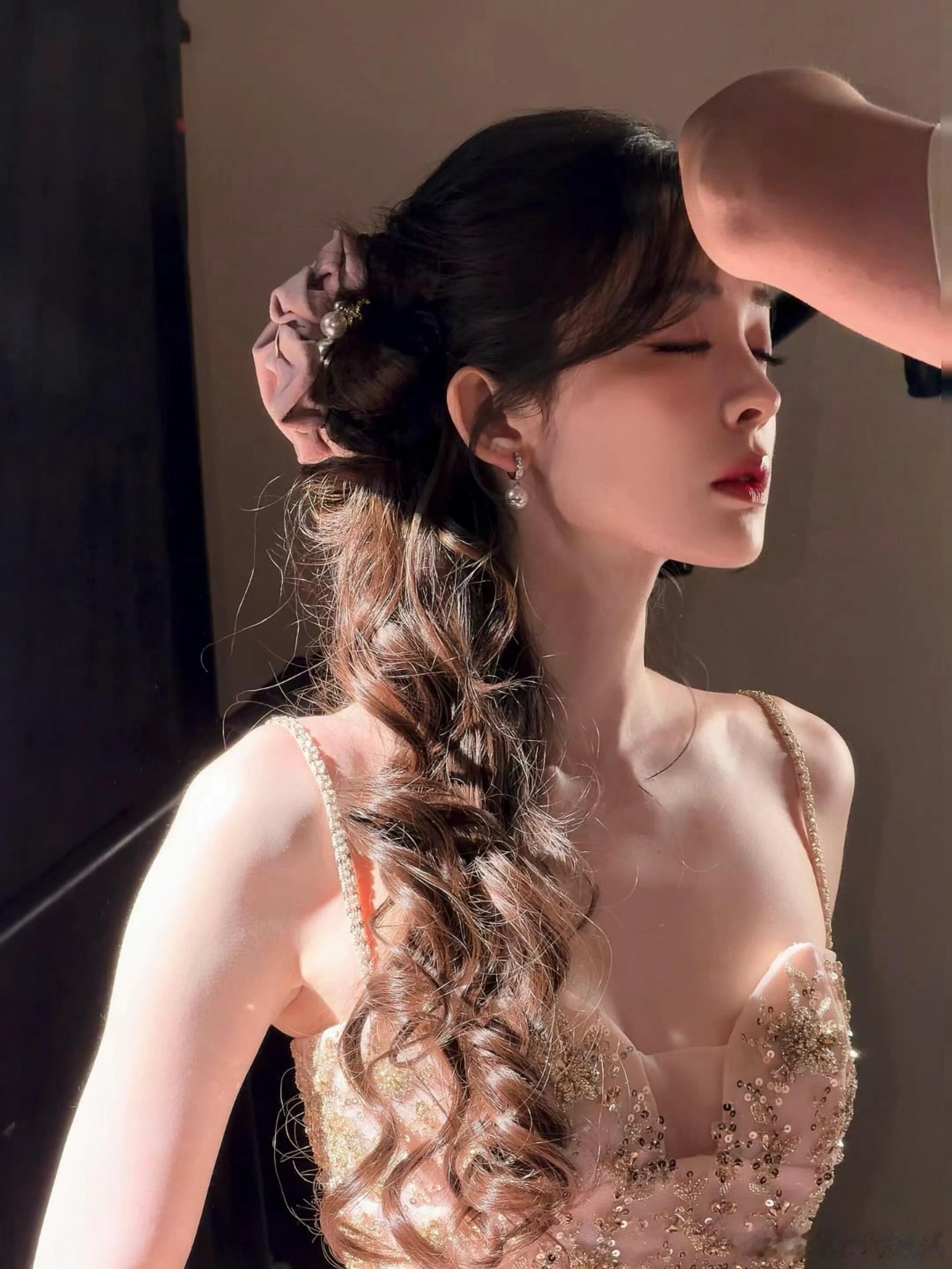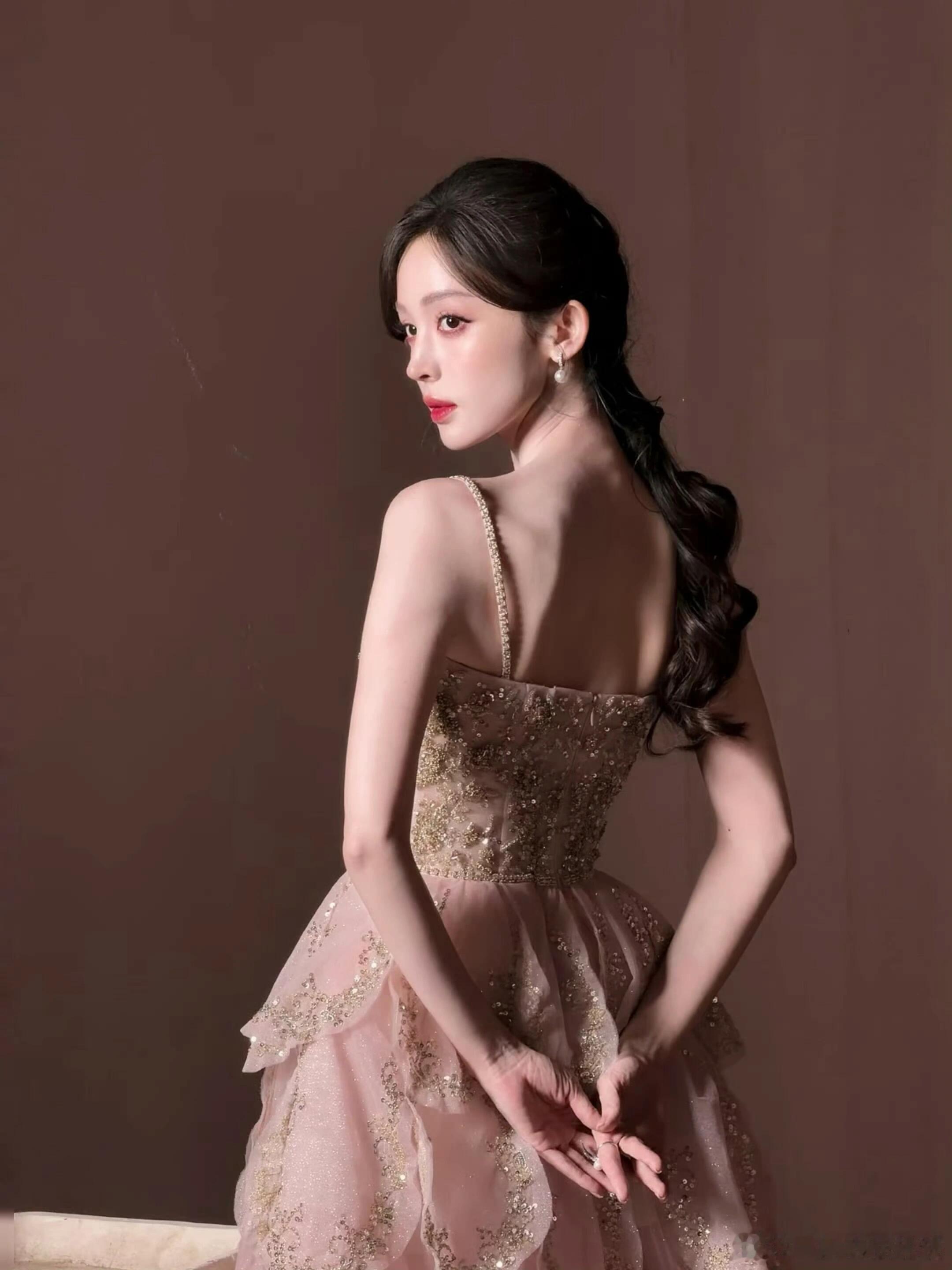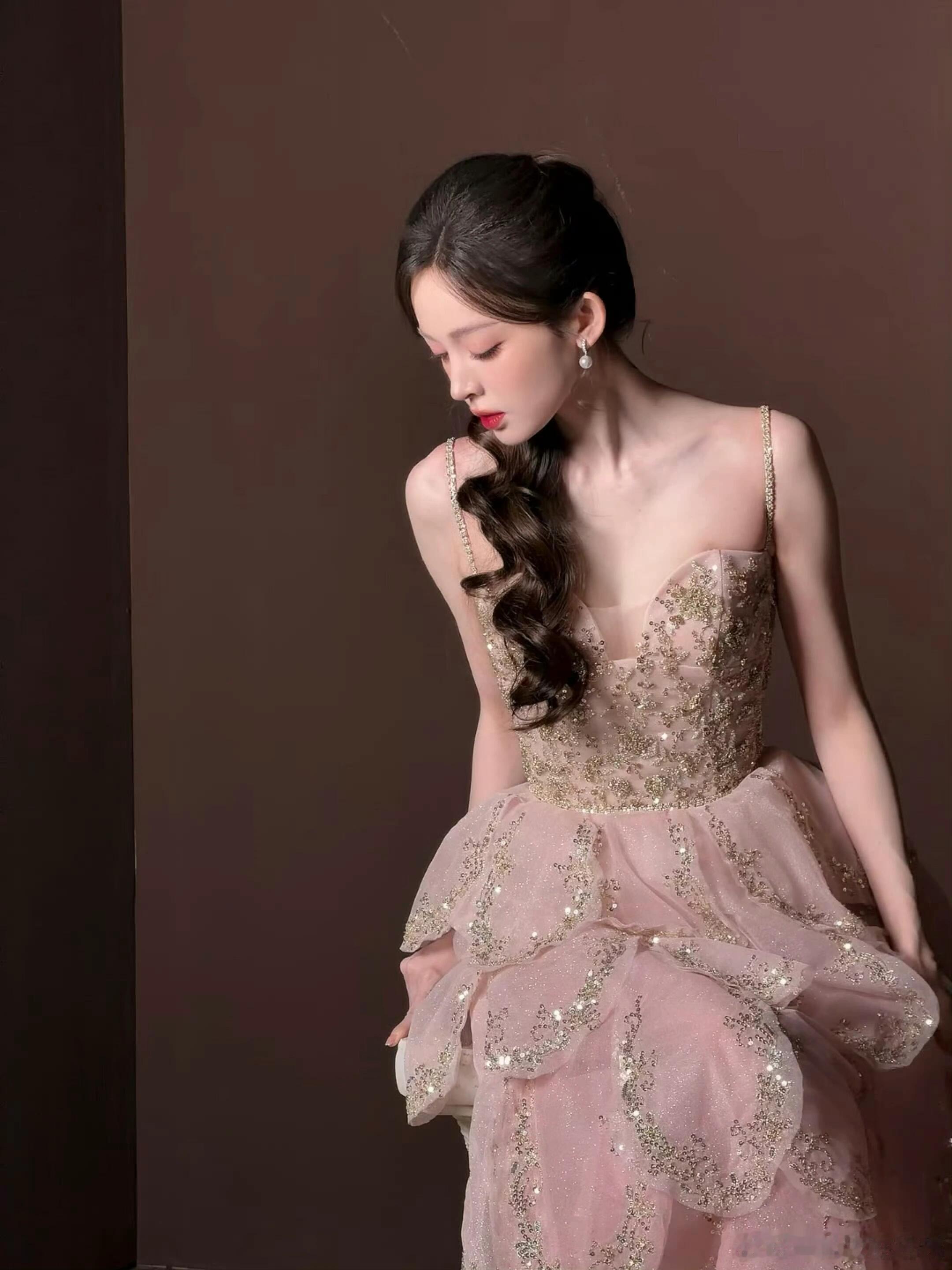 娜扎今天品牌直播造型上身IVAN YOUNG粉色吊带花瓣裙,美神🥰好好过大年