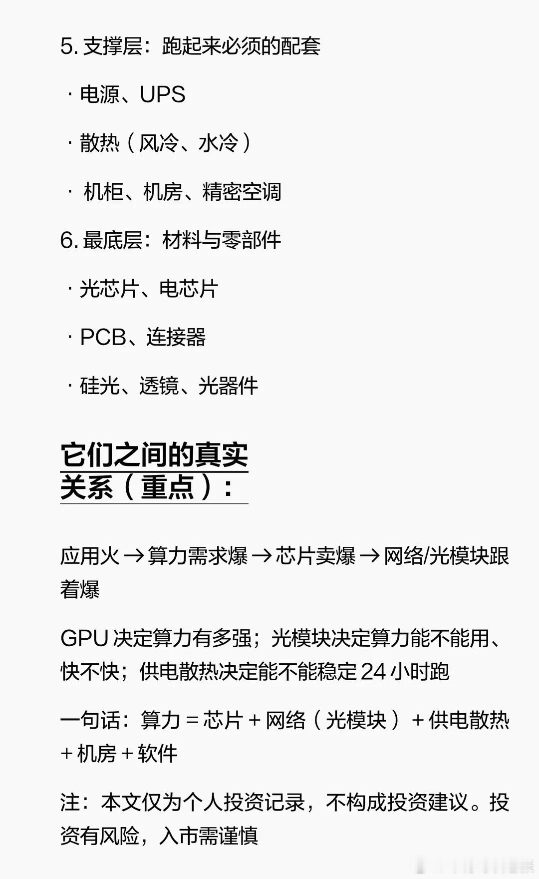AI算力极简产业链算力产业链分6层:应用层赚钱,算力中心整合资源,核心硬件如GPU最值钱,互联硬件如光模块决定算力效率,配套如电源散热确保稳定,底层材料与零部件支撑运行算力数字化发展
