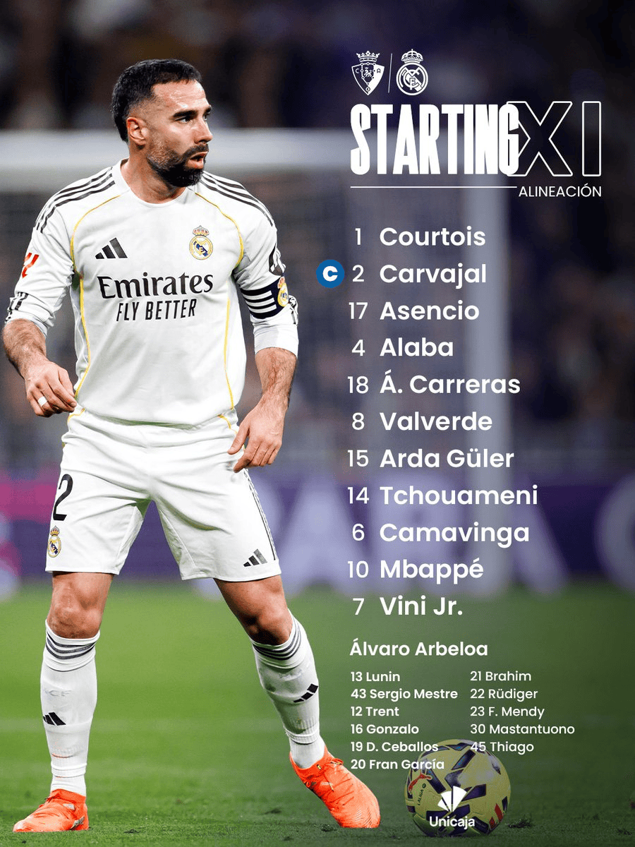 虎扑02月22日讯西甲第25轮,皇马客场挑战奥萨苏纳,赛前,双方公布了本场比赛首发名单。