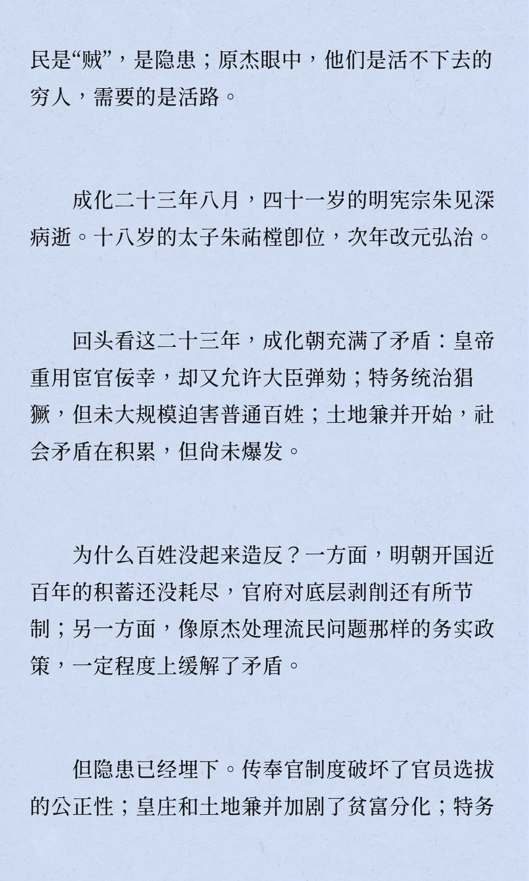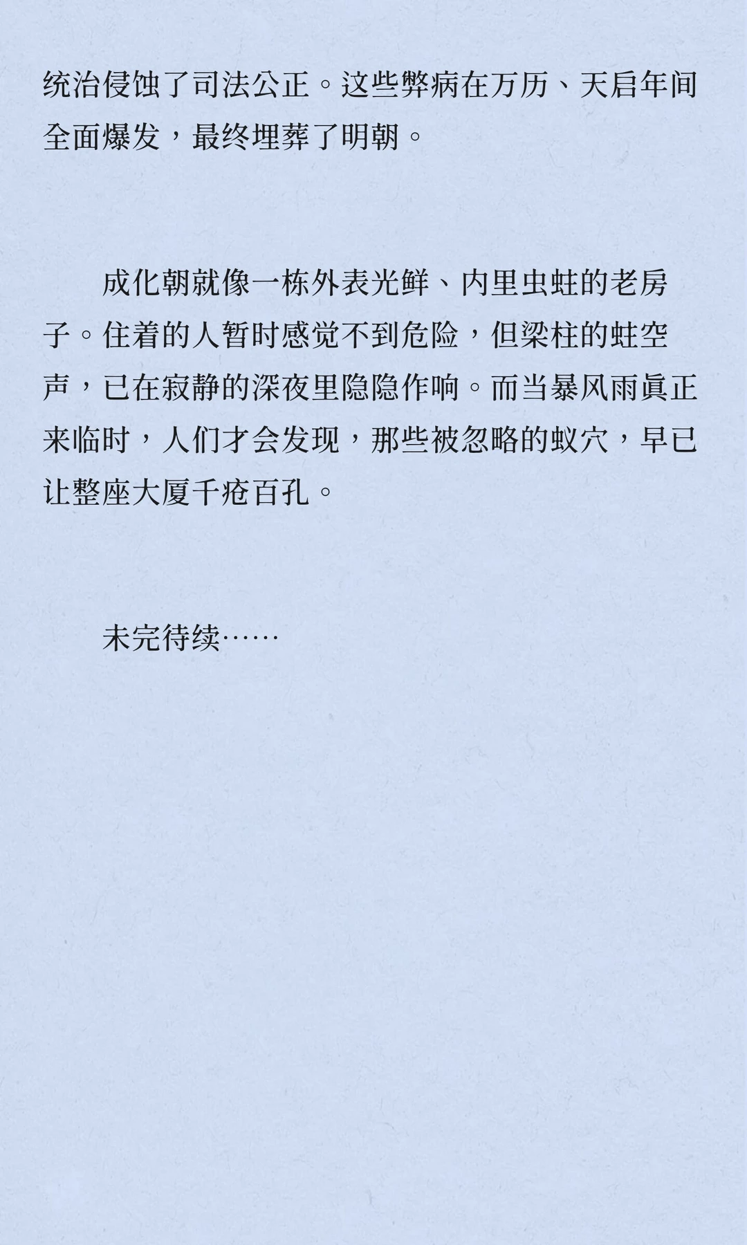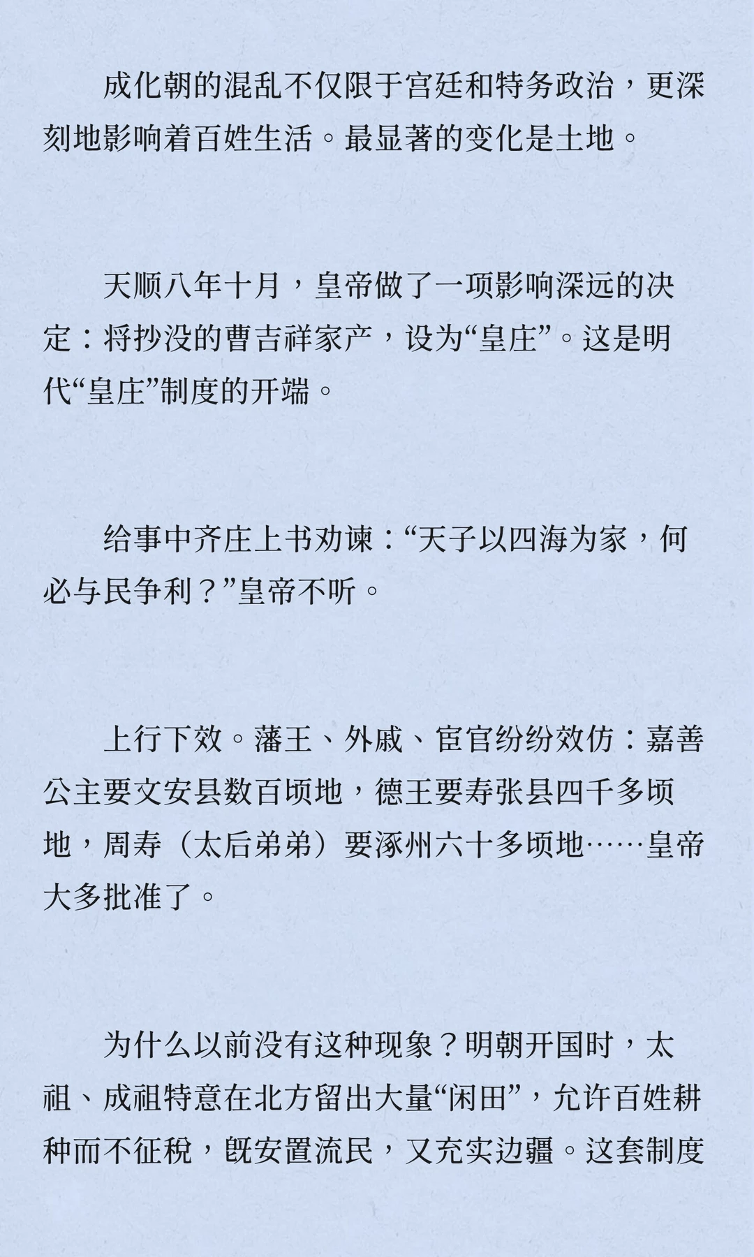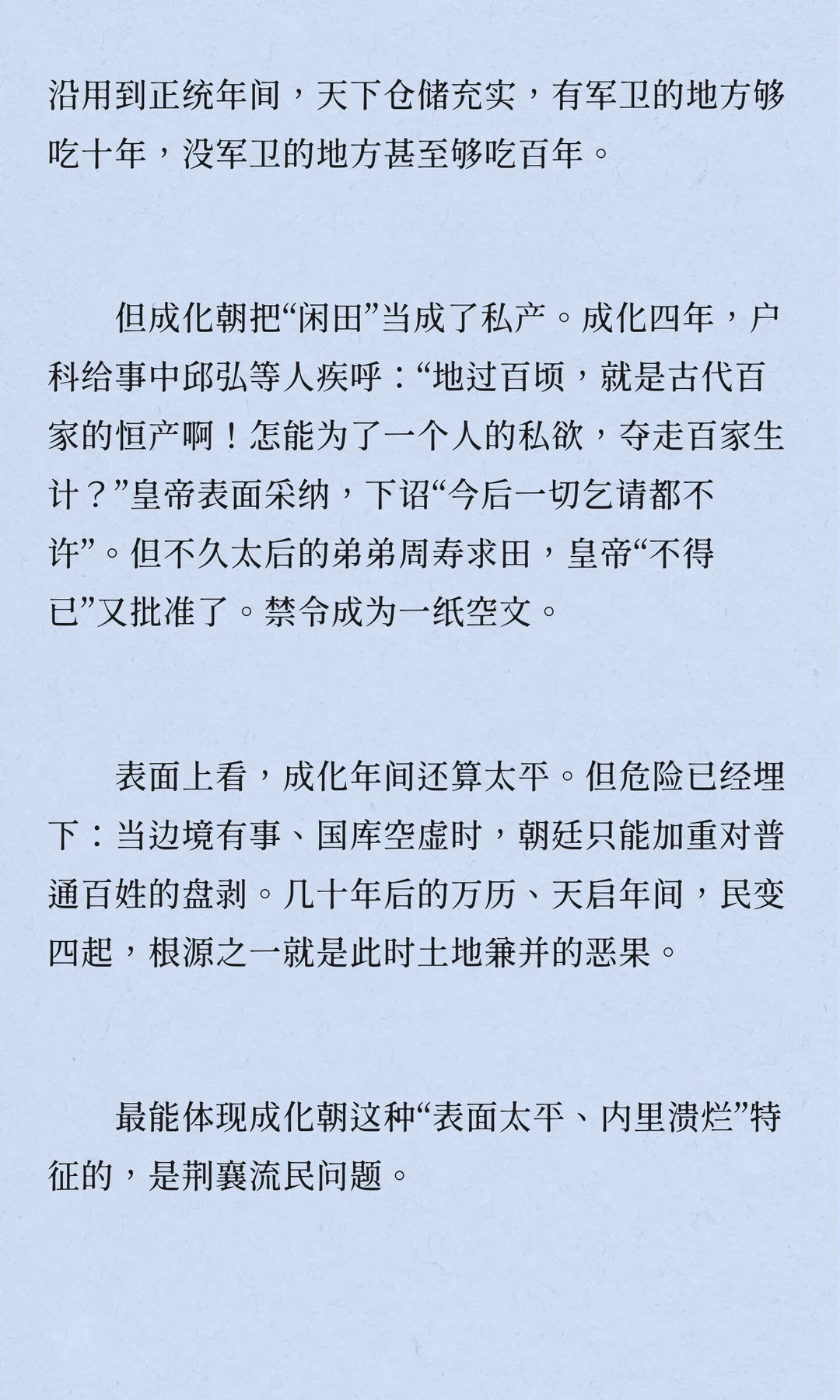 成化年间,朱见深即位后,宫廷权力高度集中于万贵妃和汪直,特务统治和宦官专权加剧。土地兼并和流民问题逐渐积累,社会矛盾虽未爆发,但埋下隐患。成化朝表面太平,实则内里溃烂,为明朝最终覆灭埋下伏笔。