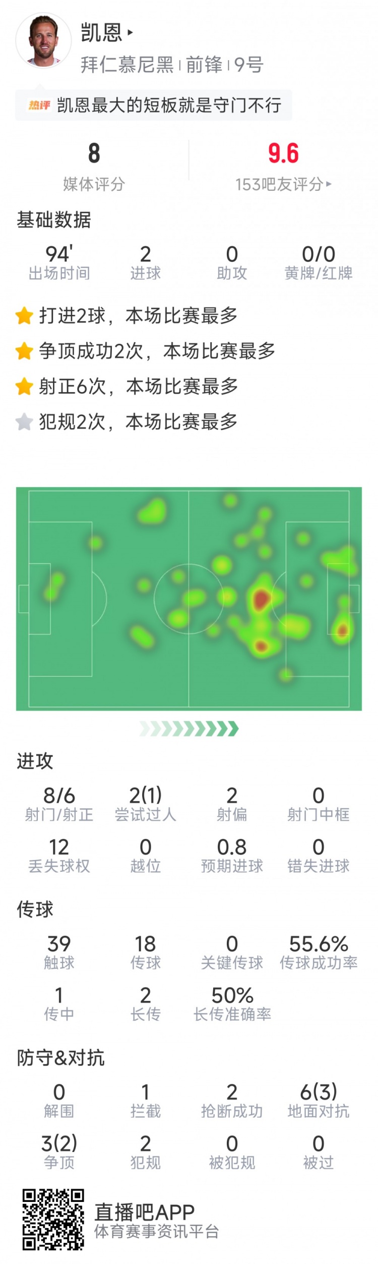 直播吧2月22日讯在本轮德甲,拜仁3-2击败法兰克福。凯恩本场梅开二度,以下为他在本场数据:
