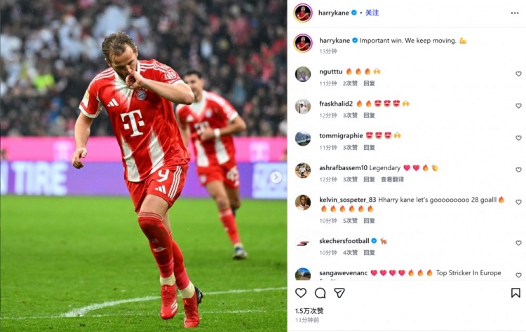 凯恩也在赛后通过社媒晒出自己进球后的庆祝照,并配文:“重要的胜利,我们继续前进!”