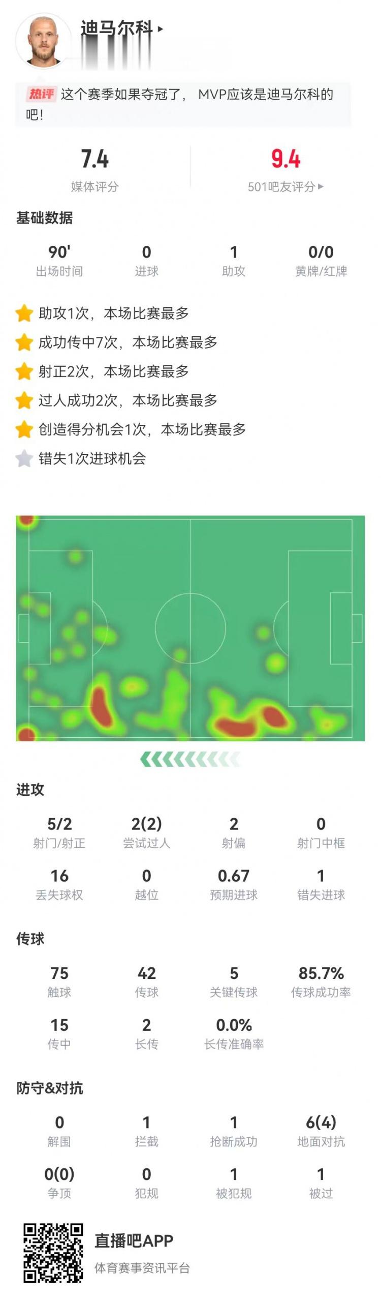 迪马尔科本场比赛首发踢满全场,贡献1次助攻+5次关键传球,15次传中、7次成功,此外5次射门、2次射正并有1次错失进球,并且6次对抗4次成功。
