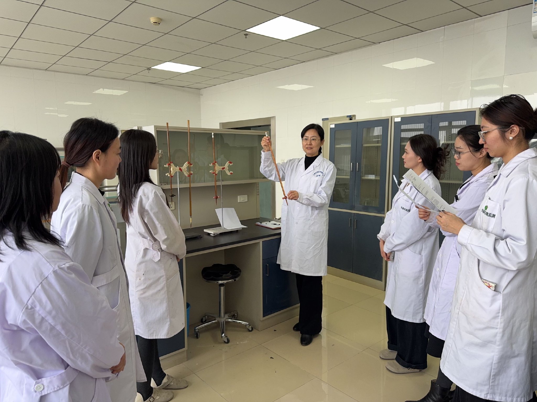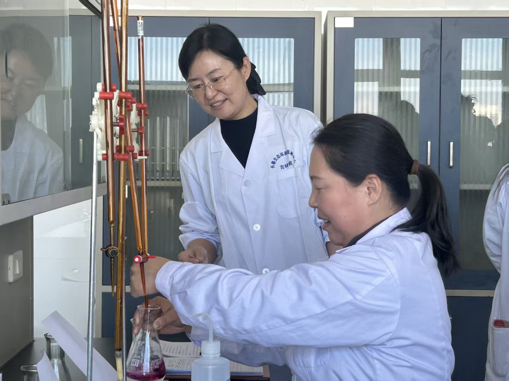 “请大家注意,滴定管在自来水冲洗后,一定要再根据吸取液的性质选用不同的清洗剂清洗,最后依次用自来水和蒸馏水冲洗,自然晾干。”吉林省长春生态环境监测中心化学分析部部长王琦对参训人员细致讲解。