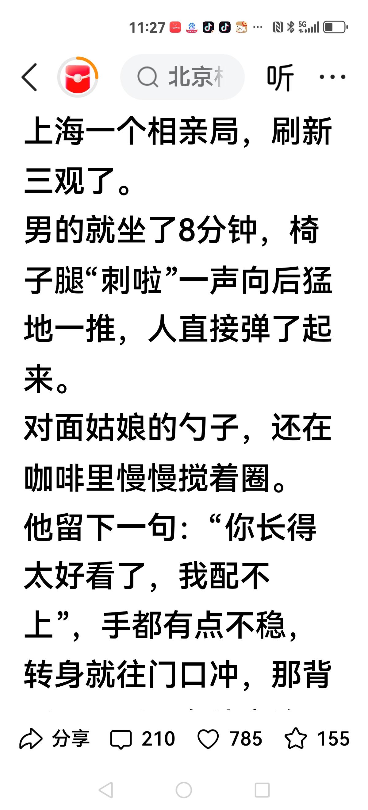 【是人间清醒还是自卑?】 上海一场相亲局,一位小伙子面对女孩,过了8分钟,突然说了一句:你太漂亮了,我不配。 说完撒腿就跑,就如同债主追债一样。 女孩冷静喝完咖啡,付了钱,把8分钟编成段子发到网上。 有人说: 宁可错过,不可放可。武大郎都能得到过潘金莲,不在乎天长地久,只在乎曾经拥有。 大多数人赞成男孩的做法,娶花容易,养花难,有自知之明是好事。 也有人认为自卑,太自卑了,何必跑?付完账,优雅离开不是更好吗?