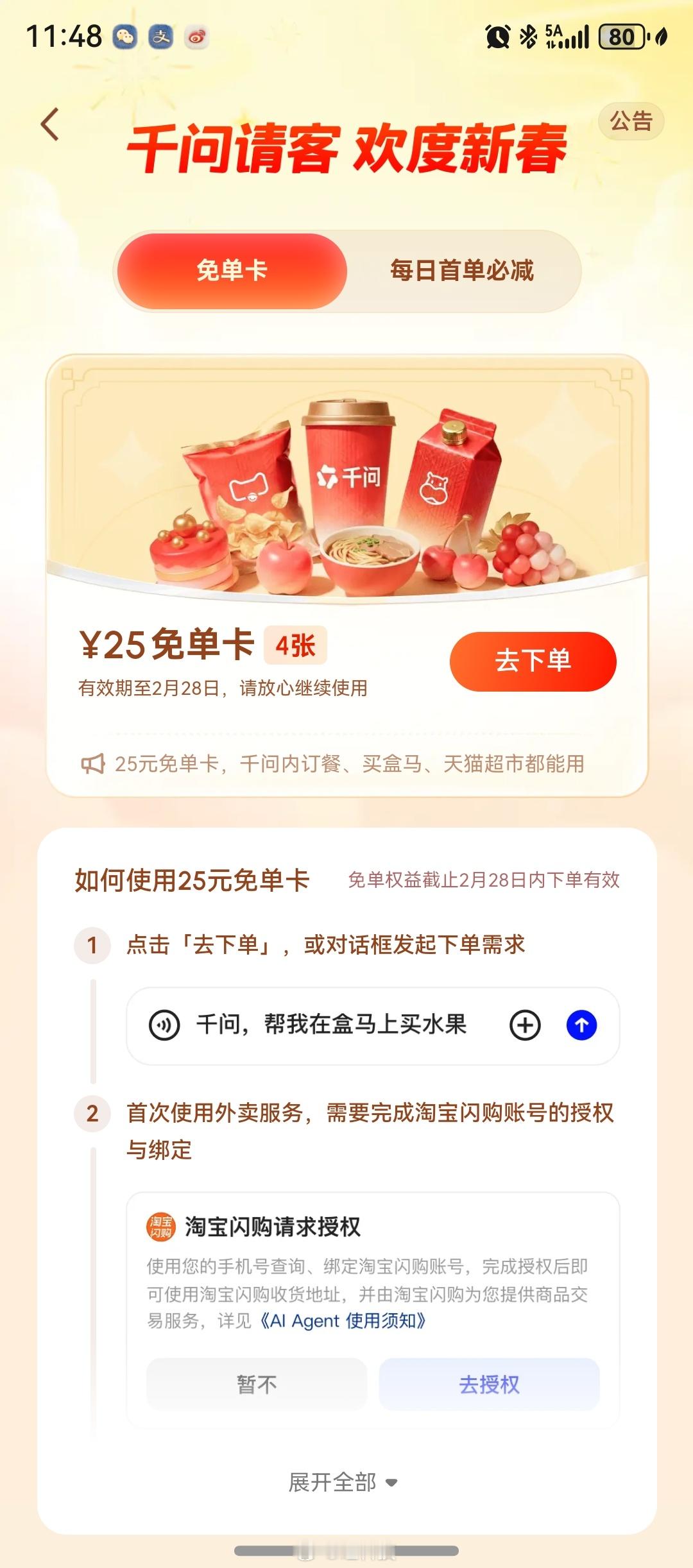 今年春节千问非常火,在各个场景都很实用了,免单卡覆盖吃喝玩乐出行全场景。点外卖、买百货、订景点门票、电影票、机票酒店都能用,一句话就能搞定,省心又省钱。日常查信息、办事情也超顺手,AI实实在在帮我们把生活变轻松了