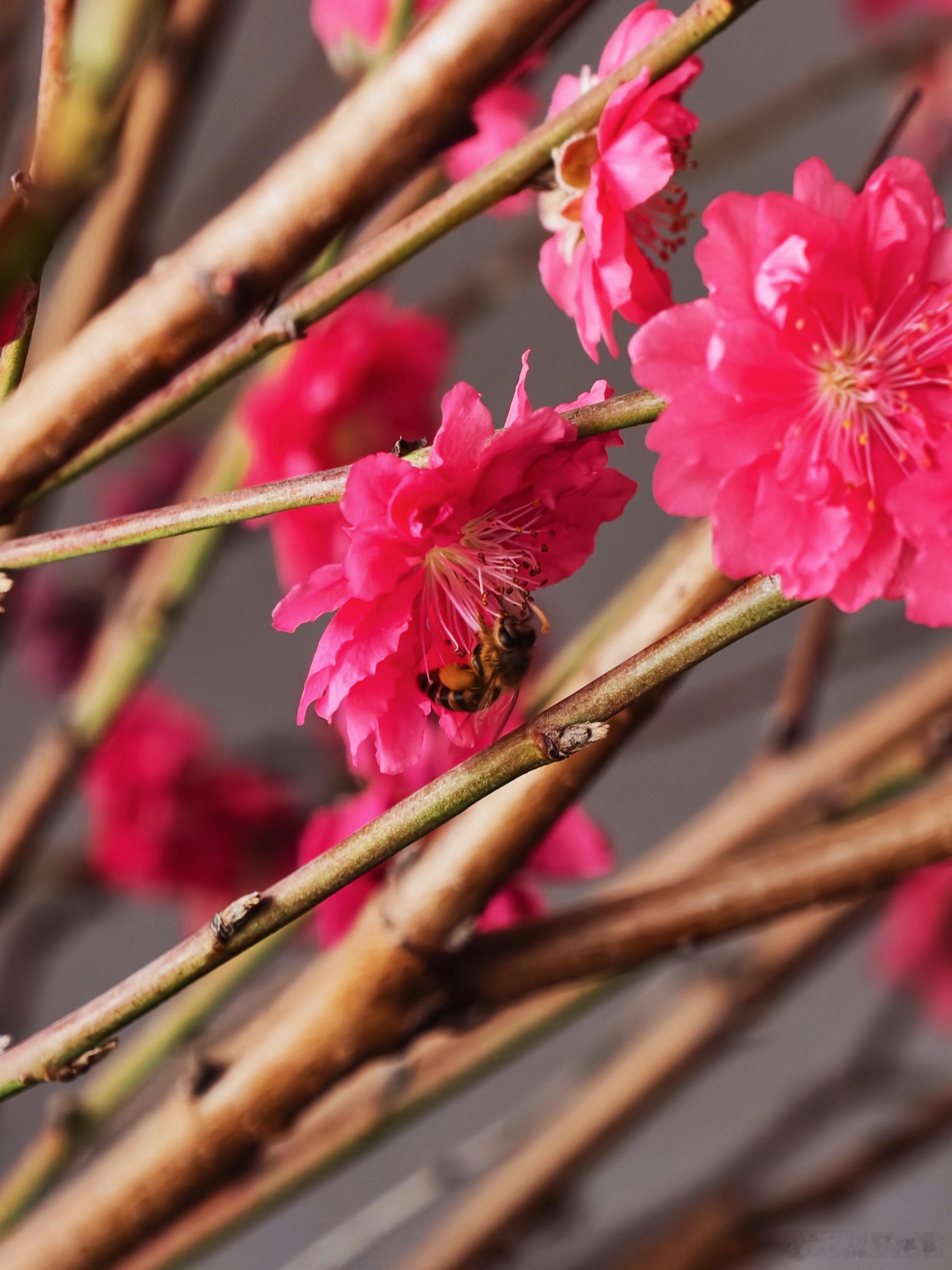 家中桃花娇艳欲滴,引来蜜蜂疯狂采蜜!春节摄影大赛摄影世界投稿黄文说